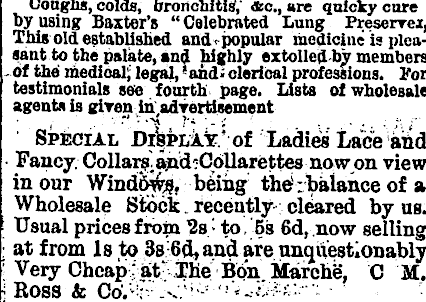 Conglis, colds, bronchitis,' <tc, ure quicky care byuaing Baxter's "Celebrated Lung Preserrei, This old established and popular medicine is pleasant to the palate, «nd highly extolled by members of the medioal; legal, 'and; clerical professions. Por testimonials see fourth page. Lists of wholesale agent* is giyen m advertisement , . ••■.- ••-* V- -■; ' ■ . .... ;\f Special DigPLiT* of Ladies Lace and • Fancy. Collar9 ; ajad:CoUarette3 nowpn view m our Wind&w,?, being thezbalanceof a Wholesale Stock . receutly-; cleared by us. [ Usual prices from ?b : to. 'ss 6d,.now selling : at from Is to 3s6d,and are unquestionably 1 Very Cheap! St-ihe Bon Marehg, O M. 'Ross k Gti&.<: i:j - <! '< -■&?■£'""- ■ ■