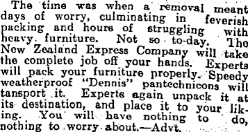 The tune was when a removal meant days of worry, culminating in feverish packing and hours of struggling with heavy, furniture. Not so to-day. Xh o New Zealand Express Company will the complete job off your hands. Experts will pack your furniture properly. Speedy weatherproof “Dennis” pantechnicons will tansport Experts again unpack it at its destination, and place it to your lik ing. You’ will have nothing to do nothing to worry about.—Advt. ’