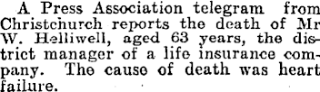 A Press Association telegram from Christchurch reports the death of Mr W. Helliwell, aged 63 years, the district manager of a life insurance company. Tho cause of death, was heart failure.