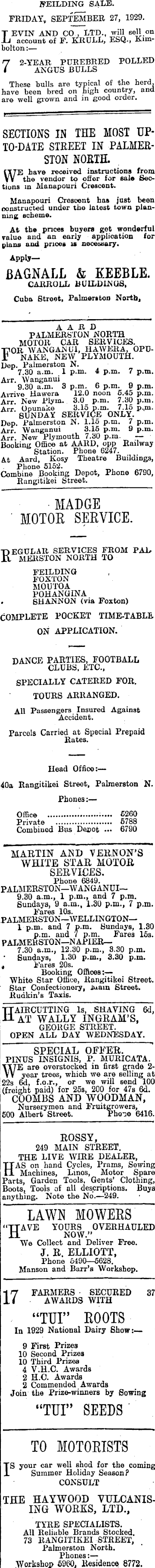fi’EILDING SALE. j FRIDAY, SEPTEMBER 27, 1929. LEVIN AND CO , LTD., will sell on account of F. KRULL, ESQ., Kimbolton:— 2-YEAR PUREBRED POLLED ANGUS BULLS 7 These hulls are typical of the herd, have been bred on high country, and are well grown and in good order. SECTIONS IN THE MOST UP-TO-DATE STREET IN PALMERSTON NORTH. WE have received instructions from the vendor to offer for sale Sections in Manapouri Crescent. Manapouri Cresoent has just been constructed under the latest town planning scheme. At the prices buyers got wonderful value and an early application for plans and prices is necessary. Apply— BAGNALL & KEEBLE. CAIUIOLL JJUILDISQS, Cuba Btroet, Palmerston North, AA R D PALMERSTON NORTH MOTOR CAR SERVICES. FOR AVANGANUI, HAWERA, OPU NAKE, NEW PLYMOUTH. Dep. Palmerston N. 7.30 a.m. 1 p.m. 4 p.m. 7 p.m Arr. Wanganui 9.30 a.m. 3 Arrive Hawera Arr. New Plym. _ . „ , * Arr. Opunake 3.10 p.m. 7.15 p SUNDAY SERVICE ONLY. Dep. Palmerston N. 1.15 p.m. 7 p.m. Arr. Wanganui 3.15 p.m. 9 p.m. Arr New Plymouth 7.30 p.m. Booking Office at AARD, opp Railway Station. Phone 6247. A.t Aard, Kosy Theatre Buildings, Phone 5152. Combine Booking Depot, Phone 6790, Rangitikei Street. p.m. 6 p.m. 9 p.m. 12.0 noon 5.45 p.m. 3.0 p.m. 7.30 p.m. 3.15 p.m. 7.15 p.,mMADGE MOTOR SERVICE. Regular services from Palmerston NORTH TO feilding FOXTON MOUTOA POHANGINA SHANNON (via Foxton) COMPLETE POCKET TIME-TABLE ON APPLICATION. DANCE PARTIES, FOOTBALL CLUBS. ETC., SPECIALLY CATERED FOR. TOURS ARRANGED. All Passengers Insured Against Accident. Parcels Carried at Special Prepaid Rates. Head Office:— 40a Rangitikei Street, Palmerston N. Phones:— Office 6260 Private 6788 Combined Bus Depot ... 6790 MARTIN AND VERNON’S WHITE STAR MOTOR SERVICES. Phone 6849. PALMERSTON—WANGANUI—--9.30 a.m., 1 p.m., and 7 p.m. Sundays, 9 a.m., 1.30 p.m., 7 p.m. Fares 10s. PALMERSTON—WELLINGTON—--1 p.m. and 7 p.m. Sundays, 1.80 p.m. and 7 p.m. Fares 15s. PALMEBSTON—NAPIER—--7.30 a.m., 12.30 p.m., 8.30 p.m. ' Sundays, 1.30 p.m., 3.30 p.m. , Fares 20s. Booking Offices:— White Star Office, Rangitikei Street. Star Confectionery, luara Street. Rudkin’s Taxis. HAIR CUTTING Is, SHAVING 6d, AT WALLY INGRAM’S, GEORGE STREET. OPEN ALL DAY WEDNESDAY. SPECIAL OFFER. PINUS INSIGNIS, P. MURICATA. WE are overstocked in first grade 2year trees, which we are selling at 22s 6d, f.0.r., or we will send 100 (freight paid) for 255, 200 for 47s 6d. COOMBS AND WOODMAN, Nurserymen and Fruitgrowers, 500 Albert Street. Pho'jo 6416. ROSSY, 249 MAIN STREET. THE LIVE WIRE DEALER, HAS on hand Cycles, Prams, Sewing Machines, Linos, Motor Spare Parts, Garden Tools, Gents’ Clothing, Boots, Tools of all descriptions. Buys anything. Note the N 0.—249. LAWN MOWERS Have yours overhauled NOW.” We Collect and Deliver Free. J. R. ELLIOTT, Phone 5490—5628. Manson and Barr’s Workshop. 17 FARMERS SECURED AWARDS WITH 37 “TUI” ROOTS In 1929 National Dairy Show:— 9 First Prizes 10 Second Prizes 10 Third Prizes 4 V.H.C. Awards 2 H.C. Awards 2 Commended Awards Join the Prize-winners by Sowing “TUI” SEEDS TO MOTORISTS IS your car well shod for the coining Summer Holiday Season? CONSULT THE HAYWOOD VULCANISING WORKS, LTD., TYRE SPECIALISTS. All Reliable Brands Stocked. 73 RANGITIKEI STREET, Palmerston North. Phones : Workshop 5960, Residence 8772.