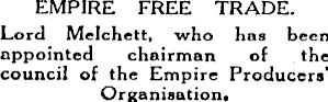 EMPIRE FREE TRADE. Lord Melchett, who has been appointed chairman of the council of the Empire Producers’ Organisation.