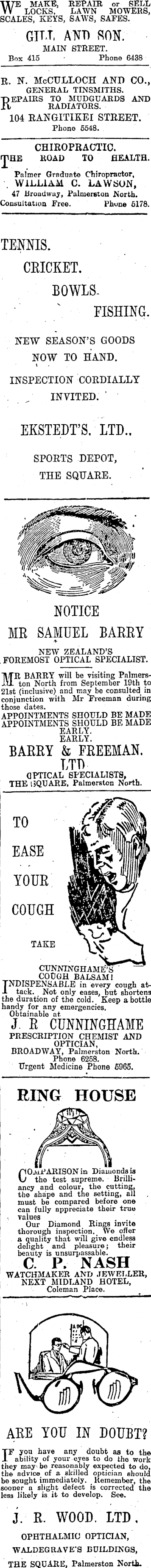 WE MAKE, REPAIR or SELL LOCKS, LAWN MOWERS, SCALES, KEYS, SAWS, SAFES. GTT-T, AND RON. MAIN STREET. Box 415 Phono 6438 R. N. McCTJLLOCH AND CO., GENERAL TINSMITHS. Repairs to mudguards and RADIATORS. 104 RANGITIKEI STEEET. Phono 5548. CHIROPRACTIC. IJIHE ROAD TO HEALTH. Palmer Graduate Chiropractor, WILLIAM C. LAWSON, 47 Broadway, Palmerston North. Consultation Free. Phone 6178. TENNIS. CRICKET. BOWLS. FISHING. NEW SEASON’S GOODS NOW TO HAND. INSPECTION CORDIALLY INVITED. ' EKSTEDT’S. LTD., SPORTS DEPOT, THE SQHARE. ¥ NOTICE MR SAMUEL BARRY NEW ZEALAND’S FOREMOST OPTICAL SPECIALIST. MR BARRY will be visiting Palmerston North from September 19th to 21st (inclusive) and may be consulted in conjunction with Mr Freeman during those dates. APPOINTMENTS SHOULD BE MADE APPOINTMENTS SHOULD BE MADE EARLY. EARLY. BARRY & FREEMAN. LTD OPTICAL SPECIALISTS, THE ISQUARE. Palmerston North. t--7 $ TO EASE YOUR COUGH TAKE CUNNINGHAME’S COUGH BALSAM! INDISPENSABLE in every cough a J- tack. Not only eases, but shorte: the duration of the cold. Keepabott handy for any emergencies. Obtainable at J. E CUNNINGHAME PRESCRIPTION CHEMIST AND OPTICIAN, BROADWAY, Palmerston North. Phone 6258. Urgent Medicine Phone 5965. RING HOUSE COMPARISON in Diamonds is the test supreme. Brilliancy and colour, the cutting, the shape and the setting, all must be compared before one can fully appreciate their true values Our Diamond Rings invite thorough inspection. We offer a quality that will give endless delight and pleasure; their beauty is unsurpassable. C. P. NASH WATCHMAKER AND .JEWELLER, NEXT MIDLAND HOTEL, Coleman Place. / im ARE YOU IN DOUBT? IF you have any doubt as to the ability of your eyes to do the work they may be reasonably expected to do, the advice of a skilled optician should be sought immediately. Remember, the sooner a slight defect is corrected the less likely is it to develop. See. J. R. WOOD. LTD, OPHTHALMIC OPTICIAN, WALDEGRAVE'S BUILDINGS, J THE SQUARE, Palmerston North.