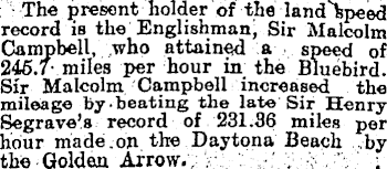 The present holder of the land'bpeed record is the Englishman, Sir Malcolm Campbell, who attained a speed of 245.7- miles per hour in the Bluebird. Sir Malcolm Campbell increased the mileage by beating the late Sir Henry Segrave’s record of 231.36 miles per hour made on the Daytona Beach by the Golden Arrow. .