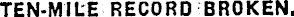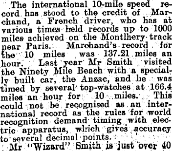 The international 10-mile speed record has stood to the credit of Marchand, a French driver, who has at various times held records up to 1000 miles achieved on the Montlhery track near Paris. Marchand’s record for the 10 miles was 137.21 miles an hour. Last year Mr Smith visited the Ninety Mile Beach with a specially built car, the Anzac, and he was timed by several' top-watches at 166.4 miles an hour for 10 miles. This could not be recognised as an international record as the rules for world recognition demand timing with electric apparatus, wlrich gives accuracy to several decimal points. Mr “Wizard” Smith is just over 40