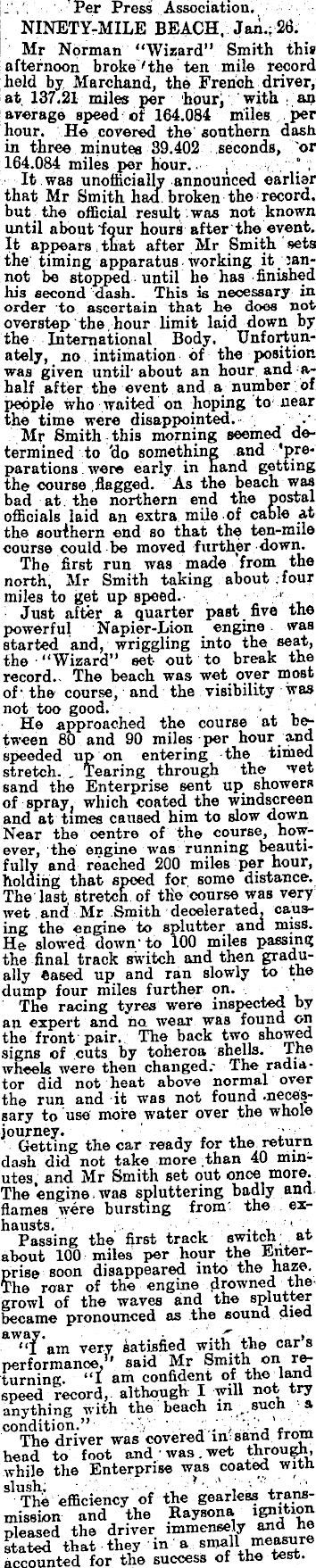 Per Press Association. NINETY-MILE BEACH, Jan.. 26. Mr Norman “Wizard” Smith this afternoon broke 'the ten mile record held by Marchand, the French driver, at 137.21 miles per hour, with an average speed or 164.084 miles per hour. He covered the southern dash in three minutes 89.402 seconds, or 164.084 miles per hour. . It was unofficially announced earlier that Mr Smith had broken the record, but. the official result was not known until about four hours after the event. It appears that after Mr Smith sets the timing apparatus working it cannot be stopped until he has finished his second dash. This is necessary in order to ascertain that he does not overstep the hour limit laid down by the International Body. Unfortunately, no intimation of the position was given until' about an hour and ahalf after the event and a number of people who waited on hoping to near the time were disappointed. , V Mr Smith this morning seemed determined to do something and 'preparations were early in hand getting the course flagged. As the beach was bad at the northern end the postal officials laid an extra mile of cable at the souihern end so that the ten-mile course could be moved further down. The first run was made from the north, Mr Smith taking about four miles to get up speed. Just after a quarter past five the powerful Napier-Lion engine was started and, wriggling into the seat, the “Wizard” set- out to break the record. The beach was wet over most of' the course, and the visibility was not too good. He approached the course at between 80 and 90 miles per hour and speeded up on entering the timed stretch. . Tearing through the wet sand the Enterprise sent up showers of spray, which coated the windscreen and at times caused him to slow down Near the oentre of the course, however, the engine was running beautifully and reached 200 miles per hour, holding that speed for some distance. The last stretch of the course was very wet and Mr Smith decelerated, causing the engine to splutter and miss. He slowed down'to 100 miles passing the final track switch and then gradually eased up and ran slowly to the dump four miles further on. The racing tyres were inspected by an expert and no wear was found on the front pair. The back two showed signs of cuts by toheroa shells. The wheels were then changed. The radiator did not heat above normal over the run and it was not found .necessary to use more water over the whole journey. , , , Getting the car ready for the return dash did not take more than 40 minutes, and Mr Smith set out once more. The engine was spluttering badly and. flames were bursting from the exhausts. , .. , , Passing the first track switch at about 100 miles per hour the Enterprise soon disappeared into the haze. The roar of the engine drowned the growl of the waves and the splutter became pronounced as the sound died “1 am very satisfied with the car’s performance/’ said Mr Smith on returning. “I am confident of the lamd speed record, although I will not try anything with the beach in such a C °The driver was covered in sand from head to foot and was wet through, while the Enterprise was coated witn Sll The efficiency of the gearless transmission and the Raysona ignition pleased the driver immensely and he stated that they in a small measure accounted for the success of the test.