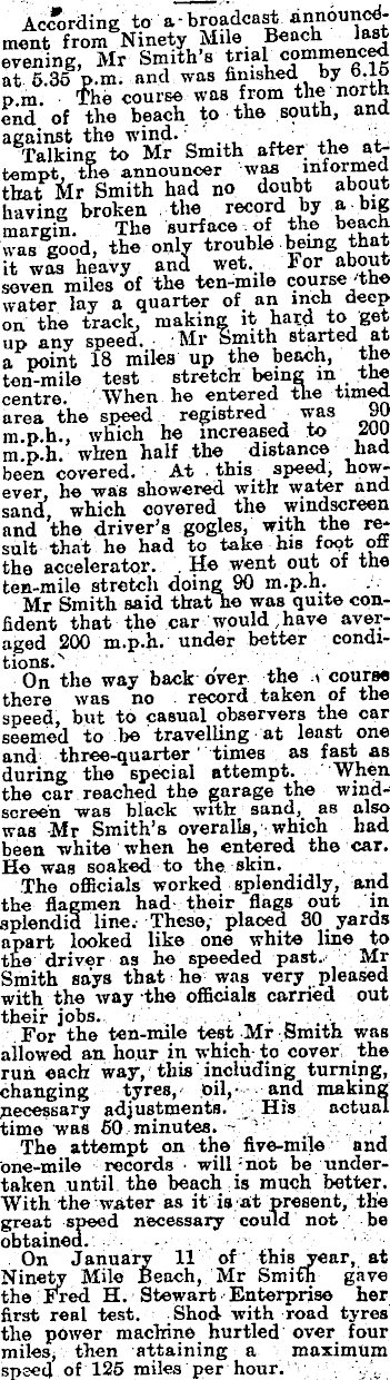According to a broadcast announcement from Ninety Mile Beach last evening, Mr Smith’s £nal commenced at 6.35 p.m. and was finished by 6.15 p.m. The course waß from the north end of the beach to the south, and against the wind. ...... , Talking to Mr Smith after the attempt, the announcer was informed that ilr Smith had no doubt about having broken the record by a big margin. The surface of the beach was good, the only trouble being that it was heavy and wet. For about seven miles of the ten-mile course -the water lay a quarter of an men deep on the track, making it hard to get up any speed. Mr Smith started at a point 18 miles up the beach, the ten-mile test stretch being in the centre. When he entered the timed area the speed registred was 90 m.p.h., which he increased to 20U m.p.h. when half the distance had been covered. At this, sp«ed, however, he "was showered with water and sand, which covered the .windscreen and the driver's gogles, with the resuit that he had to take his foot oft the accelerator. .He went out of the ten-mile stretch doing 90 m.p.h. Mr Smith said thathe was quite confident that the car would have averaged 200 m.p.h. under better conditions. ' On the way back over the > course there was no record taken of the speed, but to casual observers the car seemed to lie travelling at least one and three-quarter times as fast as during the special attempt. When the car reached the garage the windscreen was black with sand, as also was Mr Smith’s overalls, which had been white when he entered the car. Ho was soaked to the skin. The officials worked splendidly, and the flagmen had their flags out in splendid line. These, placed 30 yards apart looked like one white line to the driver as he speeded past. Mr Smith says that he was very pleased with the way the officials carried out their jobs. For the ten-mile test Mr Smith was allowed an hour in which to cover the run each way, this including turning, changing tyres, .oil,- and making pecessary adjustments. His actual time was 60 minutes. The attempt on the five-mile and one-mile records will not be undertaken until the beach is much better. With the water as it is at present, the great speed necessary could not be obtained. On January 11 of this year, at Ninety Mile Beach, Mr Smith gave the Fred H. Stewart Enterprise her first real test. Shod with road tyres the power machine hurtled over four miles, then attaining a maximum spsed of 125 miles per hour.