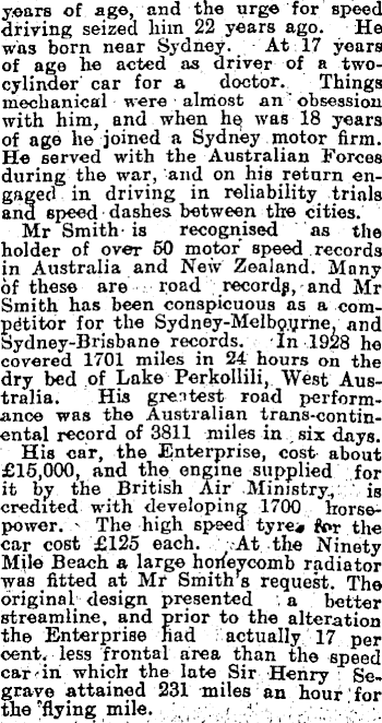 years of age, and the urge for speed driving seized him 22 years ago. He was born near Sydney. At 17 years of age he acted as driver of a twocylinder car for a doctor. Things mechanical were almost an ' obsession with him, and when he was 18 years of age he joined a Sydney motor firm. He served with the Australian Forces during the war, and on his return engaged in driving in reliability trials and speed dashes between the cities. Mr Smith is recognised as the holder of over 50 motor speed records in Australia and New Zealand. Many of these are road record?, and Air Smith has been conspicuous as a competitor for the Sydney-AlelbQ.vme, and Sydney-Brisbane records. In 1928 he covered 1701 miles in 24 hours on the dry bed of Lake Perkollili, West Australia. His greatest road performance was the Australian trans-contin-ental record of 3811 miles in six days. His car, the Enterprise, cost about £15,000, and the engine supplied for it by the British Air Alimstry., is credited with developing 1700 horsepower. The high speed tyre* for the car cost £125 each. At the Ninety Mile Beach a large honeycomb radiator was fitted at Mr Smith’s request. The original design presented a better streamline, and prior to the alteration the Enterprise had actually 17 per cent, less frontal area than the speed car in which the late Sir Henry Segrave attained 231 miles an hour for the’flying mile.