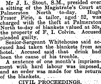 Mr J. L. Stout, S.M., presided over a sitting of the Alagistrate’s Court at Palmerston North to-day. Hugh Fraser Pirio, a tailor, aged 52, was charged with the theft at Palmerston North to-day of blankets valued at 3os, the property of F. I. Colvin. Accused pleaded guilty. Senior-Sergeant Whitehouse said accused had taken the blankets from an hotel. Accused said that drink had been the cause of his trouble. A sentence of one month’s imprisonment with hard labour was imposed, and an order was made for the return of the blankets. CIVIL PROCEEDINGS.