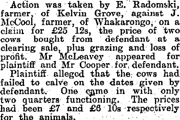Action was taken by E. Radomski, farmer, of Kelvin Grove, against J. AlcCool, farmer, of Whakarongo, on a claim for £25 12s, the price of two cows bought from defendant at a clearing sale, plus grazing and loss of profit. Air McLeavey appeared for plaintiff and Air Cooper for defendant. Plaintiff alleged that the cows had failed to calve on the dates given by defendant. One qfime in with only two quarters functioning. The prices had been £7 and £6 10s respectively for the animals.