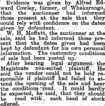 Evidence was given by Alfred Edward Cowley, farmer, of Whakarongo, that the auctioneer had informed those present at the sale that they could rely with confidence on the dates given by defendant. W. H. Aloffatt, the auctioneer at the sale, said he had informed those present that the dates given had been kept by defendant for his own personal information. The customary conditions of sale had been qiosted up. After hearing legal argument the Alagritrate non-suited plaintiff.' He said the vendor could not be held responsible if plaintiff had failed to attend the opening of the sale and hear the conditions read. It could hardly ho expected, he said, that they should be read with each head of stock offered.
