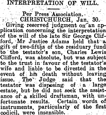 INTERPRETATION OF WILL. Per Press Association. ■ CHRISTCHURCH, Jan. 30. Giving reserved judgment application concerning the interpretation of the will of the late Sir George Clifford, Mr Justice Adams held that a gift of two-fifths of the residuary fund to the testator’s son, Charles Lewis Clifford, was absolute, but was subject to the trust in favour of the testator’s wife and liable to be divested in the event of his death without leaving issue. The’ Judge said that the testator was disposing of a large estate, but he did not seek the assistance of a skilled draftsman, with unfortunate results. Certain words of instruments, particularly of the first codicil, were insensible.