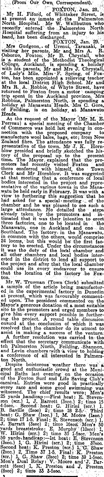 (From Our Own, Correspondent). FOSITON, Jan. 28. Mr H. Fiford, of Whittaker Street, is at present an inmate of • the Palmerston North Hospital. Mr W. Wallbutton who recently entered the Palmerston North Hospital suffering- from an injury to his hand, has been discharged. FOXTON, Jan. 29. Mrs Gudgeon,. of Urenui, Taranaki, is visiting her parents, Mr and Mrs A. R. Osborne, Foxton. Mr B. Chrystall, who is a student of tho Methodist Theological College, Auckland, is spending a holiday with his parents, Mr and Mrs J. Chrystall, of Lady's Mile. Miss ■F. Spring, of Foxton, has been appointed a relieving teacher at tho local District High School. Mr and Mrs R. A. Robbie, of Whyte Street, have returned to Foxton from a motor camping trip spent in the Auckland province. Mrs Robbins, Palmerston North, is spending a holiday at Manawatu Heads. Mrs C. Gore, of Fcilding, is on holiday at Manawatu Heads. ' f At tho request of the. Mayor (Mr M. E. Perroau) a special mooting of tho Chamber of Commerce was hold last evening in connection with tho proposed company to manufacture wool bodes, bags, etc; from New Zealand fibre. The attendance was fully representative of tho town. Mr J. IC. HornSlow presided and briefly skotchcd the history of tho proposal up to tho present time. The Mayor explained that tho promoters had recently visited Foxton and there conferred with himself, the Town Clerk and Mr Hornblow. It was suggested at that meeting that a conference of local bodies interested in tho project and representative of tho various towns in the Manawatu be held early in February. It was with a snow to furthering this suggestion that ho had asked for a special - meeting of tho chamber and he was pleased to see such a largo attendance. Ho detailed the steps already taken by the promoters and intimated that it wa3 their intention to erect three factories, ono to bo located in tho Manawatu, ono in Auckland and one in Southland. The factory, in tho l\| anawa tu, in common with the others, would comprise 24 looms, but this would bo' tho first factory to bo erected. Under tho circumstances it was tho duty of the local chamber and all other chambers and local bodies interested in the district to . lend all support to the project and after that the local chamber could use its every endeavour to ensure that the location of the factory be Foxton. Mr W. Trueman (Town Clerk) submitted a sample of tho article being manufactured in the experimental factory in Dunedin at present, which was favourably commented upon. Tho president commented on tho Mayor’s generous donation of a most suitable site to the promoters and urged members to give him every support possible in furthering tho project. A round tablo discussion ensued at the conclusion of which it was resolved that tho chamber do its utmost to assist in making a success of the venture. A further resolution was carried to the effect that tho secretary communicate with teh Palmorston North, Foiling, Shannon, and Levin chambers ?with a view to holding a conference of all interested in Palmerston North. Despite boisterous weather there was a good and enthusiastic crowd at the Municipal Baths last evening on the occasion of tho Foxton Surf and Life Saving Club’s carnival. Entries were good in practically every race and some good swimming was witnessed. The chief results -wore: Men’s 25 yards handicap:—First heat: E. ’ Stevenson (scr.) 1, J. Barrett (3sec.) 2; time 15 4-sscc. Second heat: G. Hirini (scr.) 1. B. Saville (Ssoc) 2; time 18 2-5. Third heat: G. Shaw (Isec.) 1, M. Moors (lsec.) 2; time 17 1-5. Final: E. Stevensoh (scr.) 1. J. Barratt (3sec) 2; time 16sool Men’s 50 yards breaststroke: E. Murphy (lOsec) 1, W. Hirini (scr.) 2) time 30 l-sscc. Men’s 50 yards\handicap:—lst heat: E. Stevenson (3sec.) 1, G. Hirini (scr.) 2; time 37500. Second heat: K. Preston (scr.) I,"'G. shaw (2sec.) 2, Time 37 1-5. Final: K. Preston (scr.) I,G. Shaw (2sec) 2; titne 39 l-ssec. Men’s Dual Relay: V. Mooro and - J. Barrett (6sec) 1, K. Preston and J. Preston (Bscc) 2; time 33 3-ssoc. s- 1