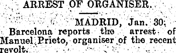 ARREST OF ORGANISER. MADRID, Jan. 30: Barcelona reports tiro arrest of Manuel Prieto, organiser of the recent revolt. v v