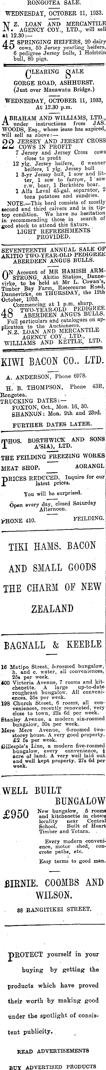 RONGOTEA SALE. WEDNESDAY, OCTOBER 11, 1933. NZ. LOAN AND MERCANTILE . AGENCY COY., LTD., will sell at 12.30: A C SPRINGING HEIFERS, 20 dairy 4: u cows, 50 Jersey yearling heifers, 6 pedigree Jersey bulls, 1 Holstein bull, 80 pigs. QLEARING gALE GORGE ROAD, ASHHURST. (Just over Manawatu Bridge.) WEDNESDAY, OCTOBER 11, 1933, At 12.30 p.m. Abraham and williams, ltd., under instructions from JAS. WOODS, Esq., whose lease has expired, will sell as above: — Of) JERSEY AND JERSEY CROSS uu cows in profit 7 Jersey and Jersey Cross cows close to profit 12 ylg. Jersey heifers, 6 weaner heifers, 1 ylg. Jersey bull 1 3-yr Jersey bull, 1 sow and litter, 1 sow to farrow, 1 sow r.w. boar, 1 Berkshire boar. 1 Alfa Laval 45-gal. separator, 2 tons potatoes and sundries. NOTE.—This herd consists of mostly second and third calvers and is in tiptop condition. We have no hesitation in recommending those in search of good stock to attend this fixture. LIGHT REFRESHMENTS PROVIDED. SEVENTEENTH ANNUAL SALE OF AKITIO TWO-YEAR-OLD PEDIGREE ABERDEEN ANGUS BULLS. ON Account of MR HAMISH ARMSTRONG, Akitio Station, Dannevirke to be held at Mr L. Cowan s, Timber Bay Farm Racecourse Road, Dannevirke, on THURSDAY, the 12th October 1933. Commencing at 1 P- m - A Q TWO-YEAR-OLD PEDIGREE 40 ABERDEEN ANGUS BULLS. Full particulars and catalogues on application to the Auctioneers HZ. LOAN AND MERCANTILE AGENCY COY., LTD., WILLIAMS AND KETTLE, LTD. KIWI BACON CO.. LTD. A. ANDERSON, Phone 6978. H. B. THOMPSON, Phone 43R, Rongotea. TRUCKING DATES: FOXTON, Oct., Mon. 16, 30. SHANNON: Mon. 9th and 23rd. FURTHER DATES LATER. HOS. BORTHWICK AND SONS A’SIA), LTD. [E FEILDING FREEZING WORKS CAT SHOP. AORANGI. RICES REDUCED. Inquire for our latest prices. You will be surprised. Open every day, closed Saturday * Afternoon. ONE 410. FEILDING. TIKI HAMS. BACON AND SMALL GOODS THE CHARM OF NEW ZEALAND BAGNALL & KEEBLE 16 Matipo Street, 6-roomed bungalow, h. and c. water, all conveniences, 25s per week. 400 Victoria Avenue, 7 rooms and kitchenette. A large up-to-date roughcast bungalow. All conveniences. 35s per week. 198 Church Street, 6 rooms, all conveniences, recently renovated, very close to town, 22s 6d per week. Stanley Avenue, a modern six-roomed bungalow, 30s per week. Mere Mere Avenue, 6-roomed twostorey house. A very good property. £2 5s per week. GUlespie’s Line, a modern five-roomed bungalow, every convenience, 4 acre of land. A very well laid out and well kept property. 27s 6d per week. WELL BUILT BUNGALOW £950 New bungalow, 5 rooms and kitchenette in choice locality near Central School. Built of Heart Timber and Totara. Every modern convenience, motor shed, concrete paths, etc. Easy terms to good man. BIRNIE. COOMBS AND WILSON. 38 RANGITIKEI STREET. PROTECT yourself in your buying by getting 1 the roducts which have proved heir worth by making good nder the spotlight of consis»nt publicity. READ ADVERTISEMENTS BUY ADVERTISED PRODUCTS