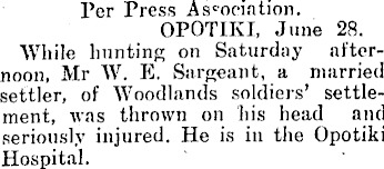 Per Press Association. OPOTIKI, June 28. While hunting on Saturday afternoon, Mr AA r . E. Sergeant, a married settler, of Woodlands soldiers’ settlement, was thrown on his head and seriously injured. He is in the Opotiki Hospital.