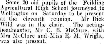 Some 20 old pupils of the Feilding Agricultural High School journeyed, to Wellington on Saturday to be present at the eleventh reunion. Mr Dick Wild was in the chair. The actingheadmaster, Mr C. B. McClure, with Mrs McClure and Miss E. M. Wright, was also present.