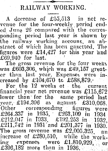 RAILWAY WORKING. A decrease of £55,513 in net revenue for the four-weekly period ended June 26 compared with the corresponding period last year is shown by the railway working account, an abstract of which has been gazetted. The figures were £14,427 lor this year and £69,940 for last. The gross revenue for the four weeks was £603,306, whjcli was £49,157 greater than last year. Expenses, were increased by £104;6'70 to £588,879.' For the 12 weeks ot the current financial year net revenue was £115,672 lower than for the same period last year, £194,396 as against* £310,068. Other corresponding figures were £264.337 in 1935, £263,109 in 1934 £212,047 in 1933. £192.253 in 1932 £211,742 in 1931’and £201,377 in 1930.’ The gross revenue was £2,005.325. an increase of £280,510, while the working expenses were £1.810,929, or £396,182 more than in 1936.