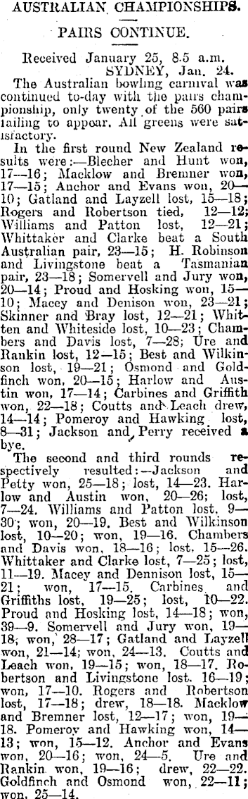 AUSTRALIAN. CHAMPIONSHIPS. PAIRS CONTINUE. Received January 25, 8 5 a.m. SYDNEY, Jan. 24. The Australian bowling carnival was continued to-day with the pans championship, only twenty of the 560 pairs 1 ailing to appoar. All greens were satisfactory. In the first round New Zealand results were:—Bleeher and Hunt won, 17—16; Macklow and Bremner won, 17—15; Anchor and Evans won, 20—• 10; Gatland and Layzell lost, 15—18; Rogers and Robertson tied, 12—12; Williams and Patton lost, 12—21; Whittaker and Clarke beat a South Australian pair, 23—15; H. Robinson and Livingstone beat a Tasmanian pair, 23 —18; Somervell and Jury won, 20—14; Proud and Hosking won, 15— 10; Macey and Denison won, 23 —21; Skinner and 'Bray lost, 12—21; Whitten and Whiteside lost, 10—23; Chambers and Davis lost, 7—28; Ure and Rankin lost, 12—15; Best and Wilkinson lost, 19—21; Osmond and Goldfinch won, 20—15; Harlow and Austin won, 17—14; Carbines and Griffith won, 22—18; Coutts and' Leach drew, 14—14; Pomeroy and Hawking lost, 8—31 ; Jackson and. Perry received a bye. The second and third rounds respectively resulted:—Jackson and Petty won, 25—18; lost, 14—23. Harlow and Austin won. 20—26; lost, 7—24. Williams and Patton lost, 9 30; won, 20—19. Best and Wilkinson lost, 10—20; won, 19—16. Chambers and Davis won, 18—16; lost, 15—26. Whittaker and Clarke lost, 7—25; lost, 11—19. Macey and Dennison lost, 15— 21; won, 17—15. Carbines, and Griffiths lost, 19—25; lost, 10—22. Proud and Hosking lost, 14—18; won, 39—9. Somervell nnd Jury won, 19— 18; won, 28—17; Gatland and La3'zell won, 21—14; won, 24—13. Coutts and Leach won, 19—15; won, 18—17. Robertson and Livingstone lost. 16—19; won, 17—10. Rogers and Robertson lost, 17—18; drew, 18—18. Macklow and Bremner lost, 12—17; won, 19— 18. Pomeroy and Hawking won, 14— 13; won, 15—12. Anchor and Evans won, 20—16; won, 24—5. Ure and Rankin won. 19—16 ; drew, 22—22. Goldfinch and Osmond won, 22—11; won, 25—14.