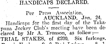 HANDICAPS DECLARED. Per Press Associalion. AUCKLAND, Jan. 24. Handicaps for the first day of the Takapuna Jockey Club’s meeting have been declared by Mr A. Tronson, as follow: — TRIAL STAKES, of £2OO. Six furlongs. Q f) ttnrl ft 1