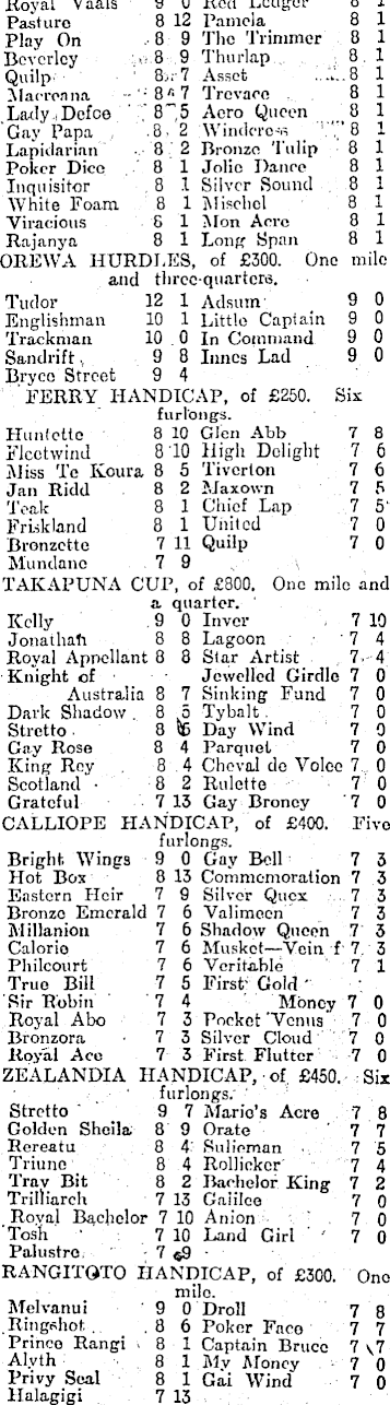 Royal Vaals Pasture 9 0 Red Ledger 8 12 Pamela 8 8 i 1 Play On 8 9 The Trimmer 8 1 Beverley 8 9 Thurlap 8 1 Quilp 8. , 7 Asset . . 8 1 Macron na 8 15 7 Trevaee 8 1 Laxly .i Defce 8”5 Aero Queen 8 1 Gay Papa 8 2 Windcrc-fi 8 1 Lapidarinn 8 2 Bronze Tulip 8 1 Poker Dice 8 1 Jolic Dance 8 1 Inquisitor 8 1 Silver Sound 8 1 White Foam 8 1 Mischcl 8 1 Vivacious 8 1 Mon Acre 8 1 Rajanya 8 1 Long Span 8 1 OREWA HURDLES, of £300. One mile and three-quarters. Tudor 12 1 Adsum 9 0 Englishman Trackman 10 1 Little Captain 9 0 10 0 In Command 9 0 Sandrift, 9 8 Innes Lad 9 0 Bryce Street 9 4 FERRY HANDICAP, of £260. Six furlongs. Hunt otto 8 10 Glen Abb 7 8 1 Flcetwind 8 TO High Delight i 8 5 Tiverton 7 6 Miss To Koun 7 6 Jan Ridd 8 2 Maxown 7 5 Teak 8 1 Chief Lap 7 5' Frisk land 8 1 United 7 0 Bronzcttc 7 11 Quilp 7 0 Mundane 7 9 TAKAPUNA CUP, of £800. One mile and a quarter. Kelly 9 0 Inver 7 10 Jonathali 8 8 Lagoon 7 4 Roval Appellant 8 8 Star Artist 7, 4 Knight of Jewelled Girdle 7 0 Australia 8 7 Sinking Fund 7 0 Dark Shadow . 8 5 Tybalt 7 0 Stretto 8 t6 Day Wind 7 0 Gay Rose 8 4 Parquet 7 0 King Roy 8 4 Cheval do Voice 7 0 Scotland ■ 8 2 Rulette 7 0 Grateful 7 13 Gay Broney 7 0 CALLIOPE HANDICAP, of £400. Five furlongs. Bright Wings 9 0 Gay Bell 7 3 Hot Box 8 13 Commemoration 7 3 Eastern Heir 7 9 Silver Qucx 7 3 Bronze Emerald 7 6 Valimecn 7 3 Millanion 7 6 Shadow Queen 7 3 Calorio 7 6 Musket—Vein f 7 3 Philcourt 7 6 Veritable 7 1 True Bill 7 5 First’ Gold ' Sir Robin 7 4 Moncv 7 0 Royal Abo 7 3 Porket 'Venus 7 0 Bronzora 7 3 Silver Cloud 7 0 Royal Aee 7 3 First Flutter 7 0 ZEALANDIA HANDICAP, of £450. Six furlongs. Stretto 9 7 Mario’s Acre 7 8 Golden Sheila 8 9 Orate 7 7 Rereatn 8 4 Sulioman 7 5 Triune 8 4 Rolliekcr 7 4. Trav Bit 8 2 Bachelor King 7 2 Trilliarch 7 13 Galileo 7 0 Royal Bachelor 7 10 Anion 7 0 Tosh 7 10 Land Girl 7 0 Palustrc 7 «9 rangitqto HANDICAP, of £300. Ono mile. Melvanui 9 0 Droll 7 8 Ringshot. . . 8 6 Poker Face 7 7 Princo Rangi 8 1 Captain Bruce 7 v.7 Alvth 8 1 My Money 7 0 Privy Seal 8 1 Gai Wind 7 0 Halagigi 7 13