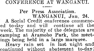 CONFERENCE AT WANGANUI. Per Press Association. WANGANUI, Jan. 24. A Social Credit conference commenced to-day and will continue all the week. The majority of the delegates are camping at Aramoho Park, the meetings being held in a large marquee. Heavy rain set in last night and continued without abatement to-day.'