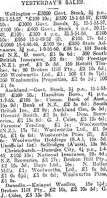 YESTERDAY’S SALES. Wellington —£3009 Govt. Stock, p.c.. 15-1-53-57" *£loo 10s; £SOO 15-1-53-57, £IOO 10s; £IOOO Govt. Bonds, 31, 15-1-53-57, £IOO 10s; £4OO Govt., Stock, 4 p.c., 30-11-48 £105; £3OO 4 p.c,, 31-5-54-58, £lO6 10s; £950 15-5-49-52 (2), £lO5 17s 6d; £IOOO 15-4-46-49, £lo3'ss; £2OO State Advances, 3| p.c., 1-9-55 60, £9B ss; 104 Bank of N.Z. D. mort, £1 9s 6d; 300 South British Insurance, £2 8s: 100 Prestige ,N Z). pref. £1 2s -3d . 150 Rotoiti Limber, 4s; 90 Broken Hill Pty., £2 10s 6tl; ICO Wcolworths Ltd., £1; 500 £1 Os 7RI; 100 Woolworths Properties, £1 6s Id; ICO. £1 6s. Auckland. —Govt. Stock, 3£ p.c., 15-1-53-57. £IOO 10o; Hamilton Boro., 4i p.c., 1-7-55, £lO5 ss: Comm. Bank of Aust, , 15s 9d; Bank of N.Z., £2 3s 6d; South British Ins., £2 8s; Auckland Gas, 9s 3d; Howard Smith, £1 3s 6d: Dom. Breweries,, £1 13s 6d ; G. J. Coles, £3 13s 6d: Farmers’ Trading. £l Is; . Woolworths (N.Z,). 17s 7d; Woolworths Ltd., £1 0s 9d, £1 Os 6d; Woolworths Pties (2), £1 6- • Woolworths Holdings (S.A.), 15s 3d. Unofficial list'; Selfridges (A’asia), 13s 9d. Christchurch. —Dunedin City, 4 3 p.c., 1-4-43 £lO2 10s; National Insurance, 19s 4d; N Z Breweries, £1 17s; Broken Hill I’ty., £2 10s 3d; Hays Ltd., 16s; N. Roller Mil’s £1; Woolworths, Ltd., £1 0s sd, £1 0s 6id; £1 0s 6d; Woolworths PLes, £1 6s. , ~ , ~ . Dunedin. —Kaiapoi Woollen, 15s lM; Broken Hill Pty., £2 10s, £2 10s 3d; G. J.-Coles, £3 13s 9d.