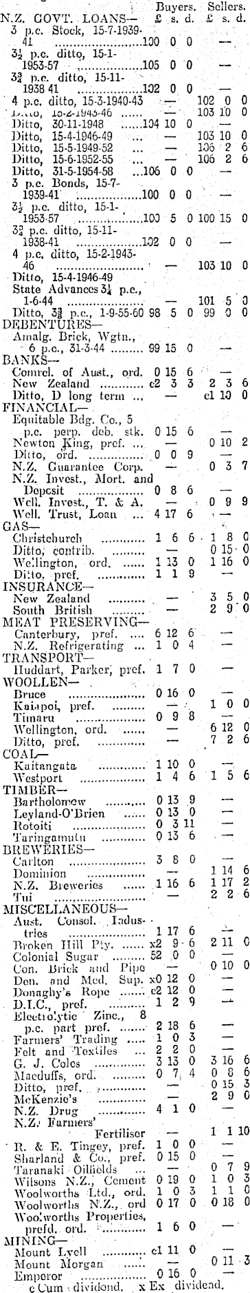 ' Buyers. Scllci s. N.Z. GOVT. LOANS— £ s. d. £ s. d. 3 p.c. Slock, 15-7-1939-41 100 0 0 — 31 p.c. ditto, 15-1-1953-57 105 0 0 — 32 p.c. ditto, 15-11-1938 41 102 0 0 — 4 p.c. ditto, 15-3-1940-43 ' r— 102 0 0 ' — ' 103 10 0 Ditto, 30-11-1948 104 10 0 — Ditto, 15-4-1946-49 ... — 103 10 0 Ditto, 15-5-1949:52 ... — 106 2 6 Ditto, 15-6-1952-55 ... — 106 2 6 Ditto, 31-5-1954-58 ...106 0 0 — 3 p.c. Bonds, 15-7-1939-41 100 0 0 — 3i p.c. ditto, 15-1-1953-57 IOO 5 0 100 15 0 32 p.c. ditto, 15-11-1938-41 1.02 0 0 — 4 p.c, ditto, 15-2-1943-46 — 103 10 0 Ditto, 15-4-1946-49 State Advances 3$ p.c., 1-6-44 — 101 5 0 Ditto, 33 p.c., 1-9-55-60 98 5 0 99 0 0 DEBENTURES— Amalg. Brick, Wgtn., 6 p.c., 31-3-44 99 15 0 BANKSCornicl. of Aust., ord. 0 15 6 — New Zealand c2 3 3 2 3 6 Ditto, D long term ... — cl 10 0 FINANCIALEquitable Bdg. Co., 5 p.c. perp. deb. stk. 0 15 6 — Newton JCing, pref. ... — 0 10 2 Ditto, ord 0 0 9 — N.Z. Guarantee Corp. — 0 3 7 N.Z. Invest., Mort. and Deposit 0 8 6 — Well. Invest., T. & A. — 0 9 9 Well. Trust, Loan 4 17 6 . GASChristchurch 1 6 6 1 8 0 Ditto; contrib — 0 15 0 Wellington, ord 1 13 0 1 16 0 Ditto, pref 1 1 9 — INSURANCE— New Zealand — 3 5 0 South British — 2 9 0 MEAT PRESERVINGCanterbury, pref 6 12 6 — N.Z. Refrigerating ... 1 0 4 — TRANSPORTHuddart, Parker, pref. 1 7 0 — WOOLLENBruce 0 16 0 — Kui.ipoi, pref — 1 0 0 Timaru 0 9 8 — Wellington, ord — 6 12 0 Ditto, prof — 7 2 6 COALKaitangata 1 10 0 — Westport 1 4 6 1 5 6 TIMBER— Bartholomew 0 13 9 — Lcvland-O’Brien 0 13 0 — llotoiti 0 3 11 — Taringamulu 0 13 6 - — BREWERIESCarlton 3 8 0 —■ Dominion — 1 14 6 N.Z. Breweries 1 16 6 1 17 2 Tni — 2 2 6 MISCELLANEOUS— Aust. Consol. Indus1 17 6 — Broken Hill Pty x2 9 6 2 11 0 Colonial Sugar 52 0 0 — Con. Brick and Pipe — 0 10 0 Don. find Mod. Sun. xO 12 0 — Donnghy’e Rope c2 12 0 — D.I.C., prof 1 2 9 — Elect! o'.ytic Zinc., 8 p.c. part prof 2 18 6 — Farmers’ Trading 1 0 6 — Felt and Textiles 2 2 0 — G. J. Coles 3 13 0 3 16 6 Maeduffs, ord 0 7, 4 0 8 6 Ditto, pref. — 0 15 6 McKenzie’s ' 2 9 0 N.Z. Drug 4 1 0 N.Z. Farmers’ Fertiliser — 1 1 10 ' R. & E. Tingey, pref. 1 0 0 — Sharland & Co., pref. 0 15 0 — Taranaki Oilfields — 0 7 9 Wilsons N.Z., Cement 0 19 0 1 0 6 Woolworths Ltd., ord. 1 0 3 1 1 0 Wool wort Iis N.Z., ord 0 17 0 0 18 0 Woolworths Properties, prefd. ord 1 6 0 — MINING— Mount Lvcll cl 11 0 — Mount Morgan — 0 11 3 Emporor 0 16 0 — e Cum dividend, x Ex dividend.