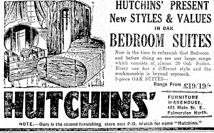 Of utj m ms HUTCHINS’ New STYLES & IN OAK Now is the' time to refurnish that Bedroom, and before doing, so see our large-; range which consists of almost 20 Oak Suites. Every one lias a different style and the workmanship is beyond reproach. 3-piece OAK SUITES— Range From £l9/19/FURNITURE WAREHOUSE, 493 Main St. E., Palmerston North. NOTE.—Ours Is the second furnishing store oast P.O. Watch for name “Hutchins.”