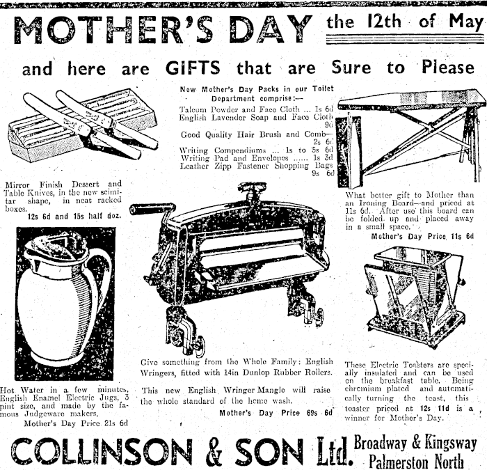 MOTHER’S DAY the 12th of May and here are GIFTS that are Sure to Please Now Mother’s Day Packs in our Toilet Department comprise:— Talcum Powder and Face Cloth ... Is 6d English Lavender Soap and Face Cloth 9d Cood Quality Hair Brush and Comb—--2s 6d Writing Compcndiums ... Is to 5s 6d Writing Pad and Envelopes ...... Is 3d Leather Zipp Fastener Shopping Bags 9s 6d Mirror Finish Dessert and Table Knives, in the now scimitar shape, in neat racked boxes. 12s 6d and 15s half doz. Give something from the Whole Family: English Wringers, fitted with 14in Dunlop Rubber Rollers. Hot Water in a few minutes, English Enamel Electric Jugs, 3 pint size, and made by the famous Judgoware makers. Mother’s Day Price 21s 6d This new English Wringer Mangle will ra the whole standard of the heme wash. Mother’s Day Price 69s 6d What better gift to Mother than an Ironing Board —and priced at 11s 6d. After use' this board can bo folded, up and placed away in a small space. Mother’s Day Price 11s 6d These Electric Toasters arc specially insulated and can be used on the breakfast table. Being chromium plated and automatically turning the toast, this toaster priced at 12s 11 d is a winner for Mother’s Dav. COLLINSON & SON Ltd,“"*’ in " s,a ’ Palmerston North