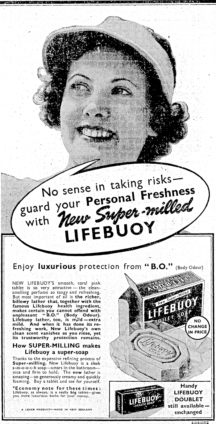 s€m Hi m w ms NSas m m Ml IM ns H •\ : P «>p:: > / Hosense in “^Freshness uard c ss****^ 0 f**wwM UFEBVJOY with Enjoy luxurious protection from “ B.O.” (Body Odour) NEW LIFEBUOY’S smooth, coral pink tablet is So very attractive the cleansmelling perfume so tangy and refreshing. But most important of all is the richer, billowy lather that, together with the famous Lifebuoy health ingredient, makes certain you cannot offend with unpleasant “ B.O.” (Body Odour). Lifebuoy lather, too, is rrJJd extra mild. And when it has done its refreshing work, New Lifebuoy’s own clean scent vanishes as you rinse, yet its trustworthy protection remains. How SUPER-MILLING makes Lifebuoy a super-soap Thanks to the expensive refining process of Super-milling, New Lifebuoy is a sleek s-m-o-o-t-h soap—smart in the bathroom—nice and firm to hold. The new lather is amazing—so generously creamy and quickly foaming. Buy a tablet and see for yourself. *Economy note for these ti mes : Lifebuoy, as always, is a really big tablet—gives you more luxurious baths for your money. A LEVER PRODUCT MADE IN NEW ZEALAND SOP NO CHANGE IN PRICE *3 mm mi wm o • v ' ; iiSS'i Handy LIFEBUOY DOUBLET still availableunchanged 2.518.15 NZ