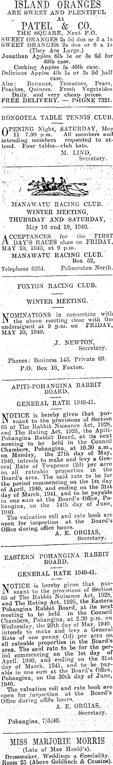 ISLAND ORANGES I ARE SWEET AND PLENTIFUL ' PATEL A & CO. THE SQUARE, Next P.O. SWEET ORANGES 2s od doz or 5 a Is SWEET ORANGES 2s doz or 6 a Is (They Are Large.) _ Jonathan Apples 6ll> Is or 5s 6d for 401 b case. Cooking Apples 5s 401 b case. Delicious Apples 41b Is or 3s 9d half case. Also: Bananas, Tomatoes, Pears, Peaches, Quinces. Fresh Vegetables Daily, and very cheao prices. FREE DELIVERY. PHONE 7221., RONGOTEA TABLE TENNIS CLUB. OPENING Night, SATURDAY, May 11 7.30 p.m. All members and: intending members requested to attend. Four tables—club bats. M. LIND, Secretary. , . / MANAWATU RACING CLUB. WINTER MEETING, THURSDAY AND SATURDAY, May 16 and IS, 1940. Acceptances for the first DAY’S RACES close on FRIDAY, MAY 10, 1940, at 9 p.m. MANAAVATU RACING CLUB, Box 52, Telephone 6264. Palmerston North. FOXTON RACING CLUB. WINTER MEETING. Nominations in connection with the above meeting close with the undersigned at 9 p.m. on FRIDAY, MAY 10, 1940. J. NEAVTON, Secretary. Phones: Business 145, Private 69. P.O. Box 16, Foxton. APITI-POHANGINA RABBIT BOARD. GENERAL RATE 1940-41. JOTICE is hereby given that purN suant to the provisions of section 5 of The Rabbit Nuisance Act, 1928, nd The Rating Act, 1925, the Apitiohangina Rabbit' Board, at its next leeting to be held in the Council hambers, Pohangina, at 10.30 a.m., a Monday, the 27th day of May, 340 intends to make and levy a Gen--al Rate of Twopence (2d) per acre a all rateable properties in tno oard’s area. The said rate to be for ie period commencing on the Ist day t April, 1940, and ending on the 31st ay of March, 1941, and to bepayable i one sum iat the Board s Office, Poangina, on the 14th day of June, }4O. The valuation roll and rate book are pen for inspection at the Board s ffice during office Secretary. E"ASTERN POHANGINA RABBIT BOARD. GENERAL RATE 1940-41. NOTICE is hereby given that pursuant to the provisions of Section 65 of The Rabbit Nuisance Act, IJ3B, and The Rating Act. 1925, the Eastern Pohangina Rabbit Board, at its liex meeting to be held in the Council Chambers, Pohangina, at 2.30 p.m. on Wednesday, the 29th day of May. 1940 intends to make and levy a General Rate of one penny (Id) per acre on all rateable properties in the Boaids area. The said rate to be for the period commencing on the Ist day or April 1940, and ending on the 31st day of March, 1941 and to be payable in one sum at the Board s Office, Pohangina, on the 30tli day of June, 19 Tjio valuation roll and rate hook are open for inspection at the Board, s Office during office hours. A- E. ORGIAS, Secretary. Pohangina, 7/5/40. MISS MARJORIE MORRIS (Late of Mae Heald’s). ressmaker. Weddings a Speciality, om 25 (Above Goldfinch. & Cousins).