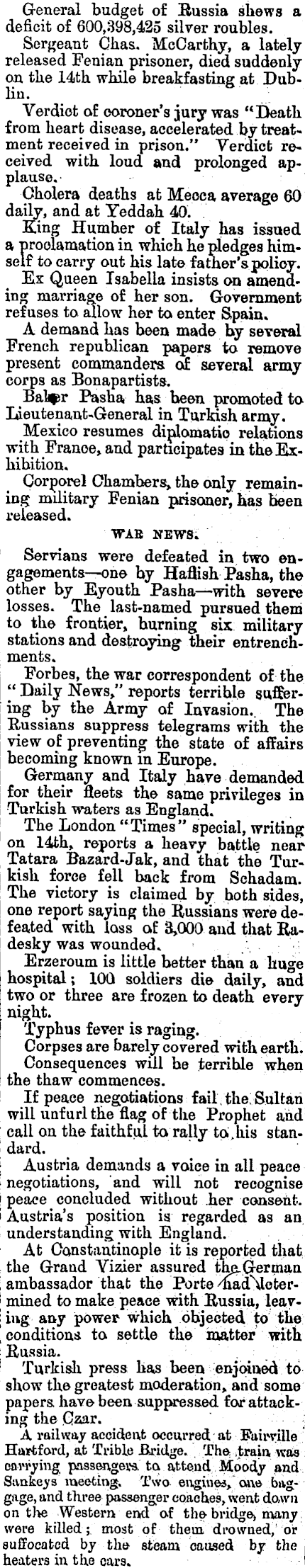 General budget of Russia shews a deficit of 600,398,425 silver roubles. Sergeant Chas. McCarthy, a lately released Fenian prisoner, died suddenly on the 14th while breakfasting at Dublin. Verdict of coroner's jury was "Death from heart disease, accelerated by treatment received m prison." Verdict received with loud and prolonged applause. Cholera deaths at Mecca average 60 daily, and at Yeddah 40. King Humher of Italy has issued a proclamation m which he pledges himself to carry out his late father's policy. Ex Queen Isabella insists on amending marriage of her son. Government refuses to allow her to enter Spain. A demand has been made by several French republican papers to remove present commanders of several army corps as Bonapartists. Baljsr Pasha has been promoted to lieutenant-General m Turkish army. Mexico resumes diplomatic relations with France* and participates m the Exhibition. Corporel Chambers^ the only remaining military Fenian prisoner, has been released. "WAS NEWS; Servians were defeated m two engagements—one by Haflish Pasha, the other by Eyouth Pasha— with severe losses. The last-named pursued them to the frontier, burning six military stations and destroying their entrenchments. Forbes, the war correspondent of the " Daily News," reports terrible suffering by the Army of Invasion.. The Russians suppress telegrams with the view of preventing the state of affairs becoming known m Europe. Germany and Italy have demanded for their fleets the same privileges m Turkish waters as England. The London "Times" special, writing on 14th, reports a heavy battle near Tatara Bazard- Jak, and that the Turkish force fell back from Schadam. The victory is claimed by both sides, one report saying the Russians were defeated with loss of 3,000 and that Radesky was wounded. Erzeroum is little better than a huge hospital; 100. soldiers die daily, and two or three are frozen to death every night. Typhus fever is raging. Corpses are barely covered with earth. Consequences will be terrible when the thaw commences. If peace negotiations fail, the; Sultan will unfurl the flag of the Prophet and call on the faithful to rally to.his standard. Austria demands a voice m all peace negotiations, and will not recognise peace concluded without her consentAustria's position is regarded as an understanding with England. At Constantinople it is reported that the Grand Vizier assured the.(^erman ambassador that the Porte /uad determined to make peace with Russia, leaving any power- which objected to the conditions to settle the matter with : Russia. . Turkish press has been enjoined to show the greatest moderation, and some papers, have- been suppressed for attack--i ing the Czar. " ; , A railway accident occurred at Eair-ville ; Hartford, at Trible Bridge. Tha .train yiaa \ carrying passenger to, attend iioody and Ssinkeys meeting. Two engine*,* o*\& baggage, and three passenger coaches, went dawn on the Western end of the- bridge many were killed ; most of them drowned,' or suffocated by tk» steam caused by the heaters m the cars.