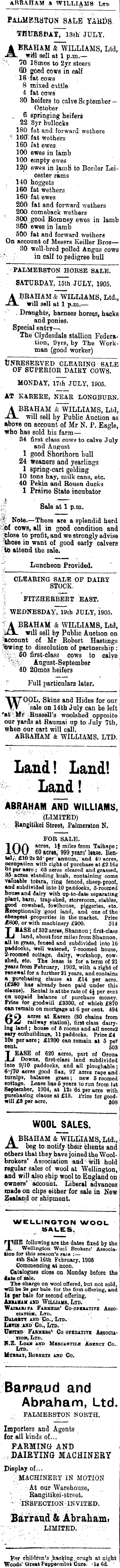 ABRAHAM * WILLIAMB Ltd PAIiMESaTON SALE YABI>B THUBBOAY, 13th JULY. A BRAHAM Ltd, J9l will sell at 1 p.m.— '. 70 18mos to 2yr steers (2) good cows in calf 16 fat cows . 8 mixed cattle 4 fat cows 30 heifers to calve September ~ October ... G springing heifers 22 Syr bullocks 180 fat and forward wethers *i 16tf \fat wethers 160 fat ewes 100 ewes in lamb 100 empty ewes 120 ewes in lamb1 to Border Leicester rams . 140 hoggets 160 fat wethers 160 fat ewes 200 fat and forward wethers 200 comeback wethers 80Q good Romney ewes in lamb 860 ewes in lamb 500 fat and forward wethers j On account of Messrs Keiller Bros— 80 well-bred polled Angus cows - ; in calf to pedigree bull PALMERSTON HOBBE SALE. SATURDAY, 15th JULY, 1905. A BRAHAM & WILLIAMS, Ltd., -XJL will sell at 1 p.m.— - - Draught?, harness horses, hacks and ponies. Special entry—: The Clydesdale stallion Federation, 9yra, by The Work- ' man (good worker) Unreserved clearing sale of superior dairy cows. MONDAY, 17th JULY, 1905. AT KARERE, NEAR LONGBUEN. A BRAHAM & WILLIAMS, Ltd, JOL will sell by Public Auction as on account of Mr N. P. Eagle, who has sold his farm— 34 first class cows to calve July and August 1 good Shorthorn bull 24 weaners and yearlings 1 spring-cart gelding 10 tons hay, niilk cans; etc. 40 Pekin and Rouen ducks 1 Prairie State incubator Sale at 1 p.m. * Note.—These are a splendid herd of cows, all in good condition and TSlose to profit, and we strongly advise those in want of good early calvers to attend the sale. Luncheon Provided. CLEARING SALE OP DAIRY STOCK. PITZHEBBERT EAST. ( ■ ■. ■ - WEDNEBDAY, 19th JULY, 1905. * A BRAHAM & WILLIAMS, Ltd, JLJL will sell by Public Auction on account of Mr Robert Hastings :owing to dissolution of partnership : -; ', 60 first-class cows to calve •■'>:■■ August-September 40 20m03 heifers " Full particulars later. WOOL, Skins and Hides for our sale on 14th July can be left ,'af-Mr Rnssell'a woolshed opposite our Yards at Raumai up to July 7th, when our cart will call. ABRAHAM & WILLIAMS, LTD. Land! Land! Land! ABRAHAM AND WILLIAMS, ' f (LIMITED) v Rangijtikei Street, Palmerston N. FOR SALE. IAA acres, If milea from Taihape; . lyu Macro,; 999 years'tone. Renta3n'£iP'2s.2d* per .annum, "and 40 acres, oconp&tion with right of purchase at £216a hi per awe ; -65 aerea cleared and grasaed, 35 acreß. standing bush, containing some valuable totara, riDR fenced, sheep-proof, and subdivided into 10 paddocks, 5-roomed bouse and dairy with up-to-date separatißg plant, barn, trap-shed, storeroom, stables, good cowshed, fowlhoiiße, piggeries, eto. Sx«eptionally, :good land, and one of the cheapest -properties in the market. Price £800, or with machinery £900. 514 I T lASE of 332acr««, Shannon; first-class JU land, about four mile 3 from Shannon, all in grass, fenced and subdivided into 16 paddocks, well watered, 7-roomed house, 2-roomed cottage, dairy, workshop, cowshed, eto. The lease is for a term of 21 yeaia from February, 1902, with a right of renewal for a further 21 years, and contains a.purchasing clause at £14 per acre. (£260 has already been paid under this clause). Rental is at the rate of 4} per cent en unpaid balance of ~ purchase money. Price for goodwill £3300, of whioh £870 can remain on mortgage at 6 per cent. 494 /?£V aereß at Karere (80 chains from \JjZ) railway station), first class dairying land; house of S rooms and all neces2 iary outbuildings, 11 paddocks. Price £4 10s peraere; £1200 can remain at 5 per cent. , .503 LEASE of 620 acres, part of Oroua Downs, first-olass land subdivided into 9/10 paddocks, and all ploughable; 6'/7O acres good flax, 97 acres rape add turnips, balance grass; new 5 roomed cottage. Lease has 5 years to run from Ist September, 1904, at 12s 6ti per acre with purchasing clause at £18. i'rioe for goodwill £S per acre. 508 WOOL SALES. A BKAHAM & WILIiIAMS, Lta., JuL beg to notify their clients and others that they have joined the Woolbrokers' Association arid* will hold regular sales of wool at Wellington, and will also ship wool to England on owners' account. Liberal advances made on clips either for sale in New Zealand or shipment. WELLINGTON WOOL SALES. THE following are the dates fixed by the Wellington Wocl Brokers' Association for this season's raie :— 4th Sale 16th February, 1905 Commencing at noon. Catalogues close on Monday before the date of sale. The charge on wool offered, but not sold, will be 2s per bale for the first oSering, and li par bale for second offering. Abraham and Williams, Ltd. WaIBABJPA FaBUEBS' Co-PPMUTIVE ABBOciATips, Ltd. Dalobct and Co., Ltd. ' Lam .and Coi, Ltd. > Unhid* Fabmibb* Go ofebaiive Association, Ltd. ;. -■ K.Z. Load akd Mxboantiijc A'okncx Co.. Ltd. f . IiCBBAT, ROBKEXS ADD Co, Banraud and Abraham, Ltd. PALMEESTON NORTH. Importers and Agents for all kinds 0f... FARMING AND .DAIRYING MACHINERY Display 0f... ; MACHINERY IN MOTION . .At our Warehouse, V Rangitikei-street. - Inspection ; invited. Barraud & Abraham, ■■;■■■":■.;.■-■ limited. For children's^hacking^ccugh at night Woods'tireat Peppermint Cure, -lafid. *