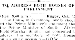 li\ ADDRESS BOTH HOUSES OF PARLIAMENT (Rec 9.40 a.m.) Hugb.v, Oct. 15 The House of Commons loudly cheered the Prime Minister’s statement thai the Prime Minister of South Africa Field-Marshal Smuts, had consented tc address the members of both Houses on an early occasion.-8.0.W.