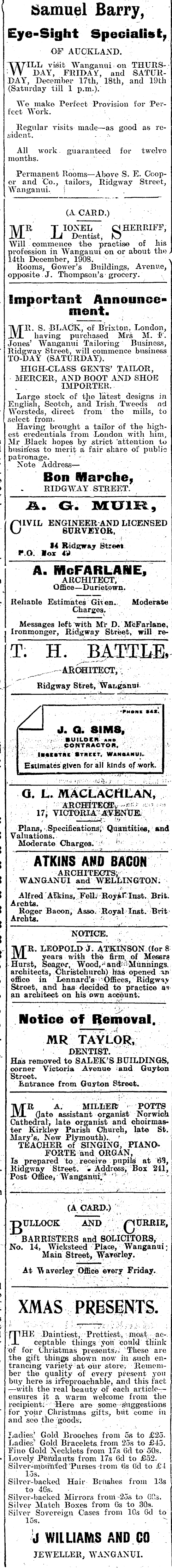 ( Samuel Barry, Eye-Sight Specialist^ OF AUCKLAND. WILL visit Wanganui. on THURSDAY, FRIDAY, and SATURDAY, December 17th, 18th, and 19th (Saturday "till 1 p.m.). Wo make Perfect Provision for Per- ■ feet Work. Regular visits made—as good as re- [ sident. ■...-. All work. guaranteed for twelve months. ' Permanent Rooms—Alx>ve S. E. C'coper and Co., tailors, Ridgway Street, Wanganui. \ ■ ' (A CARD.) MR T lONEL CjHERRIFF, . JLJ Dentist^ D Will commence the practise of his profession in Wanganui on or about the, 14th December, 1908. \ Rooms, Gower's Buildings, Avenue, opposite J. Thompson's grocery. > , ■ ■ ..•-■.■ . Important Announcement. MR. S. BLACK, of Brixton, London, having purchased Mrs M. I*'. Jones' Wanganui Tailoring Business, " Ridgway Sti'eet, will commence business TO-DAY (SATURDAY). HIGH-€LASS GENTS' TAILOR, MERCER, AND BOOT AND SHOE IMPORTER. ' Large stock of the latest designs in English, Scotch, and Irish. Tweeds nd 11 Worsteds, direct from' the mills, to select from. Having brought a tailor of the highest credentials from London with him, 1 Mr Black hopes by strict 'attention to 1 busirfess to merit a fair share of public . patronage. ' ' j Note Addressr— I ' Bon IMarche, > . RIDGWAY STREET. - A. G. MUIE, CIVIL ENGINEER AND LICENSED SURVEYOR, 14 Ridßway Street r.o. Vox <•) A. WicFARLAWE, j ARCHITECT, Office—Durietown. r Kehade Estimates Gi\en. Moderate Charges. Messages left'with Mr D. McFarlane, 1 Ironmonger, Ridgway Street, will reT. H. BATTLE, _ - ARCHITECT, . L - Ridgway Stret, Waiiganni / •l»M»l»I •«**. (—^ J. Q. BIMB, .r BUILDCR *m» j , CONTRACTOR. I««C«TRK STNCKT, WANOANUI. ■ Estimates Riven for all kinds of work. . - ■ - •>. ■ Q. L. MACLACHLAN, ARCHiTEGffy 3 17, VICTORIA AVBNtTE. ( , "-- ---' Plans,' Specifications,' Quantities, and \ Valuations. t Moderate Charges. ' f" \ ATKINS AND BACON t ARCHITECTS; { WANGANUI and WELLINGTON. i Alfred Atkins, Fell.' Royal* Inst. Brit. t A rents. > Roger Bacon, Asso. Royal Inst. Brit L Archta. • L NOTICE. I ————<■ * L "JI/TR. LEOPOLD J. ATKINSON (for 8 » J-YjL years with the firm, of Messrs \ Hurst, Seagor, Wood,'1 and- -Munnings. architects, Christohurch) has opened in 1 office in Lennard's 'Offices, Ridgwi.v Street, and has decided to practice as » an architect on his own account. i Notice of Removal. MR TAYLOR, 1 DENTIST. Has removed to SALEK'S BUILDINGS, corner Victoria Avenue iand Guyton Street. Entrance from Guyton Street. MR A. MILLER - POTTS (Jate assistant organist Norwich Cathedral, late organist and choirmaster Kirkley Parish Church, late St. Mary's, New Plymouth). ' TEACHER of SINGING, PIANOFORTE and ORGAN, Is prepared to receive pupils at 6% *. Ridgway Street. • Address, Box 211, Post Office, Wanganui/ '■ a 1. ,— (A CARD.) BULLOCK AND /^URRIE, BARRISTERS and SOLICITORS, No. 14, Wicksteed Place, Wanganui; Main Street, Waverley. At TVaverley Office every Friday. 1 : : I XMAS PRESENTS. 3 b ' "T1 , I nPHE Daintiest, Prettiest, most acr. J- ceptable things could tliink of for Christmas presents.-i These are f the gift things shown now in such entrancing variety at oiir store. Remember the quality of every present you buy here is irreproachable, and this fact —with the real beauty of each article---ensures |t a warm welcome from the recipielit: ■••'•■'-Here are some-suggestions for your, Christmas gifts, but come in and se'o tile goods; » Ladies,' Gold Brooches from 5s to £25. Ladies 15 Gold Bracelets, from 25s to £4-5. Fino Gold Necklets from' 17s'Cd to 50s. ♦ Lovely Peiixlairts from 17s 6d to £52. Silver^mbu'nted'Purses -trom (is Gd to £4 ■ / ' 15s.' ■ ' ■■■■ - ■■ ..'•■ \ Silver-backed Hair Brushes from 13s to 465. - Silver-backed-Mirrors from-25s to GO3. Silver Match Boxes from 6s to 30s. Silver Sovereign Cases from 10s (3d to 15s. . ": J WILLIAMS AND CO JEWELLER, WANGANUI.