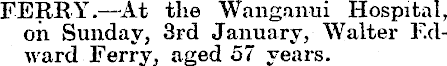 FERRY.—At the Wanganui Hospital, on Sunday, 3rd January, Walter F.clward Ferry, aged 57 years.