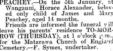 PEACHEY.—On the sth January, nt Wanganui, Horace Alexander, beloved, only child of James and Mary Peachey, aged 14 months,. Friends are informed the funeral v ill leave his parents' residence TO-MQII-ROW (THURSDAY), at 1 o'clock f-rn., for the Matarawa Church of England Cemetery.—F. Symes, undertaker.