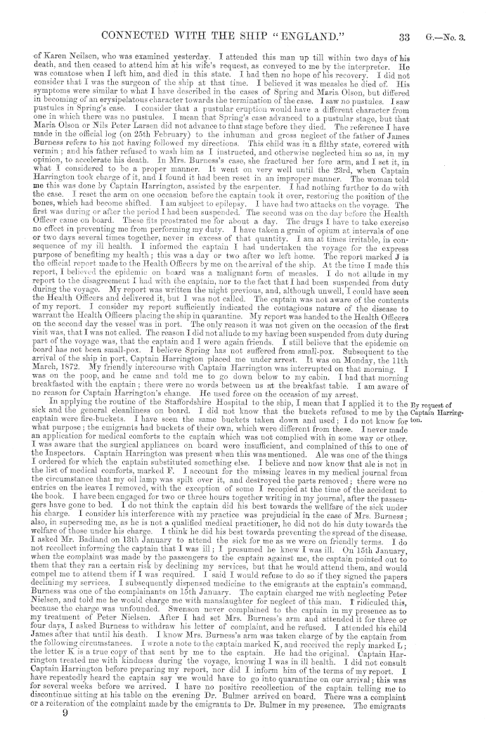 of Karen Neilsen, who was examined yesterday. I attended this man up till within two days of his death, and then ceased to attend him at his wife's request, as conveyed to me by the interpreter. He was.comatose when I left him, and died in this state. I had then no hope of his recovery. I did not consider that I was the surgeon of the ship at that time. I believed it was measles he died of. His symptoms were similar to what I have described in the cases of Spring and Maria Olson, but differed in becoming of an erysipelatous character towards the termination of the case. I saw no pustules. I saw pustules in Spring's case. I consider that a pustular eruption would have a different character from one in which there was no pustules. I mean that Spring's case advanced to a pustular stage, but that Maria Olson or Nils Peter Larsen did not advance to that stage before they died. The reference I have made in the official log (on 25th February) to the inhuman and gross neglect of the father of James Burness refers to his not having followed my directions. This child was in a filthy state, covered with vermin ; and his father refused to wash him as I instructed, and otherwise neglected him so as, in my opinion, to accelerate his death. In Mrs. Burness's case, she fractured her fore arm, and I set it, in what^ I considered to be a proper manner. It went on very well until the 23rd, when Captain Harrington took charge of it, and I found it had been reset in an improper manner. The woman told me this was done by Captain Harrington, assisted by the carpenter. I had nothing further to do with the case. _ I reset the arm on one occasion before the captain took it over, restoring the position of the bones, which had become shifted. lam subject to epilepsy. I have had two attacks on the voyage. The first was during or after the period I had been suspended. The second was on the day before the Health Officer came on board. These fits prostrated me for about a day. The drugs I have to take exercise no effect in preventing me from performing my duty. I have taken a grain of opium at intervals of one or two days several times together, never in excess of that quantity. lam at times irritable, in consequence of my ill health. I informed the captain I had undertaken the voyage for the'express purpose of benefiting my health ; this was a day or two after we left home. The report marked Jis the official report made to the Health Officers by me on the arrival of the ship. At the time I made this report, I believed the epidemic on board was a malignant form of measles. I do not allude in my report to the disagreement I had with the captain, nor to the fact that I had been suspended from duty during the voyage. My report was written the night previous, and, although unwell, I could have seen the Health Officers and delivered it, but I was not called. The captain was not aware of the contents of my report. I consider my report sufficiently indicated the contagious nature of the disease to warrant the Health Officers placing the ship in quarantine. My report was handed to the Health Officers on the second day the vessel was in port. The only reason it'was not given on the occasion of the first visit was, that I was not called. The reason I did not allude to my having been suspended from duty during part of the voyage was, that the captain and I were again friends. I still believe that the epidemic on board has not been small-pox. I believe Spring has not suffered from small-pox. Subsequent to the arrival of the ship in port, Captain Harrington placed me under arrest. It was on Monday, the 11th March, 1872. My friendly intercourse with Captain Harrington was interrupted on that morning. I was on the poop, and he came and told me to go down below to my cabin. I had that morning breakfasted with the captain ; there were no words between us at the breakfast table. lam aware of no reason for Captain Harrington's change. He used force on the occasion of my arrest. In applying the routine of the Staffordshire Hospital to the ship, I mean that I applied it to the sick and the general cleanliness on board. I did not know that the buckets refused to me by the captain were fire-buckets. I have seen the same buckets taken down and used; Ido not know for what purpose ; the emigrants had buckets of their own, which were different from these. I never made an application for medical comforts to the captain which was not complied with in some way or other. I was aware that the surgical appliances on board were insufficient, and complained of this to one of the Inspectors. Captain Harrington was present when this was mentioned. Ale was one of the things I ordered for which the captain substituted something else. I believe and now know that ale is not in the list of medical comforts, marked F. I account for the missing leaves in my medical journal from the circumstance that my oil lamp was spilt over it, and destroyed the parts removed; there were no entries on the leaves I removed, with the exception of some I recopied at the time of the accident to the book. I have been engaged for two or three hours together writing in my journal, after the passengers have gone to bed. Ido not think the captain did his best towards the wellfare of the sick under his charge. I consider his interference with my practice was prejudicial in the case of Mrs. Burness; also, in superseding me, as he is not a qualified medical practitioner, he did not do his duty towards the welfare of those under his charge. I think he did his best towards preventing the spread of the disease. I asked Mr. Badland on 13th January to attend the sick for me as we were on friendly terms. Ido not recollect informing the captain that I was ill; I presumed he knew I was ill. On 15th January, when the complaint was made by the passengers to the captain against me, the captain pointed out to them that they ran a certain risk by declining my services, but that he would attend them, a