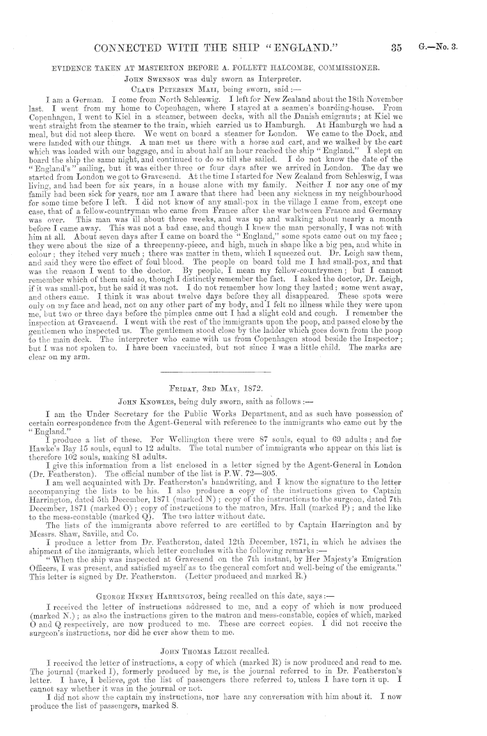 EVIDENCE TAKEN AT MASTERTON BEFORE A. EOLLETT HALCOMBE, COMMISSIONER. John Swenson was duly sworn as Interpreter. Claus Petersen Maii, being sworn, said: — lam a German. I come from North Schleswig. I left for New Zealand about the 18th November last. I went from my home to Copenhagen, where I stayed at a seamen's boarding-house. From Copenhagen, I went to Kiel in a steamer, between decks, with all the Danish emigrants; at Kiel we went straight from the steamer to the train, which carried us to Hamburgh. At Hamburgh we had a meal, but did not sleep there. We went on board a steamer for London. We came to the Dock, and were landed with our things. A man met us there with a horse and cart, and we walked by the cart which was loaded with our baggage, and in about half an hour reached the ship " England." I slept on board the ship the same night, and continued to do so till she sailed. Ido not know the date of the " England's " sailing, but it was either three or four days after we arrived in London. The day we started from London we got to Gravesend. At the time I started for New Zealand from Schleswig, I was living, and had been for six years, in a house alone with my family. Neither I nor any one of my family had been sick for years, nor am I aware that there had been any sickness in my neighbourhood, for some time before I left. I did not know of any small-pox in the village I came from, except one case, that of a fellow-countryman who came from France after the war between France and Germany was over. This man was ill about three weeks, and was up and walking about nearly a month before I came away. This was not a bad case, and though I knew the man personally, I was not with him at all. About seven days after I came on board the " England," some spots came out on my face ; they were about the size of a threepenny-piece, and high, much in shape like a big pea, and white in colour ; they itched very much ; there was matter in them, which I squeezed out. Dr. Leigh saw them, and said they were the effect of foul blood. The people on board told me I had small-pox, and that was the reason I went to the doctor. By people, I mean my fellow-countrymen; but I cannot remember which of them said so, though I distinctly remember the fact. I asked the doctor, Dr. Leigh, if it was small-pox, but he said it was not. Ido not remember how long they lasted; some w rent away, and others came. I think it was about twelve days before they all disappeared. These spots were only on my face and head, not on any other part of my body, and I felt no illness while they were upon me, but two or three days before the pimples came out I had a slight cold and cough. I remember the inspection at Gravesend. I went with the rest of the immigrants upon the poop, and passed close by the gentlemen who inspected us. The gentlemen stood close by the ladder which goes down from the poop to the main deck. The interpreter who came with us from Copenhagen stood beside the Inspector ; but I was not spoken to. I have been vaccinated, but not since I was a little child. The marks are clear on my arm. Friday, 3rd May, 1872. John Knowles, being duly sworn, saith as follows ; — I am the Under Secretary for the Public Works Department, and as such have possession of certain correspondence from the Agent-General with reference to the immigrants who came out by the "England." I produce a list of these. For Wellington there were 87 souls, equal to 69 adults ; and for Hawke's Bay 15 souls, equal to 12 adults. The total number of immigrants who appear on this list is therefore 102 souls, making 81 adults. I give this information from a list enclosed in a letter signed by the Agent-General in London (Dr. Featherston). The official number of the list is P.W. 72—305. I am well acquainted with Dr. Featherston's handwriting, and I know the signature to the letter accompanying the lists to be his. I also produce a copy of the instructions given to Captain Harrington, dated sth December, 1871 (marked N) ; copy of the instructions to the surgeon, dated 7th December, 1871 (marked O) ; copy of instructions to the matron, Mrs. Hall (marked P) ; and the like to the mess-constable (marked Q). The two latter without date. Tho lists of the immigrants above referred to are certified to by Captain Harrington and by Messrs. Shaw, Saville, and Co. I produce a letter from Dr. Featherston, dated 12th December, 1871, in which he advises the shipment of the immigrants, which letter concludes with the following remarks : — " When the ship was inspected at Gravesend on the 7th instant, by Her Majesty's Emigration Officers, I was present, and satisfied myself as to the general comfort and well-being of the emigrants." This letter is signed by Dr. Featherston. (Letter produced and marked E.) Geoege Henry Harrington, being recalled on this date, says:— I received the letter of instructions addressed to me, and a copy of which is now produced (marked N.) ; as also the instructions given to the matron and mess-constable, copies of which, marked O and Q respectively, are now produced to me. These are correct copies. I did not receive the surgeon's instructions, nor did he ever show them to me. John Thomas Leigh recalled. I received the letter of instructions, a copy of which (marked E) is now produced and read to me. The journal (marked I), formerly produced by me, is the journal referred to in Dr. Featherston's letter. I have, I believe, got the list of passengers there referred to, unless I have torn it up. I cannot say whether it was in the journal or not. I did not show the captain my instructions, nor have any conversation with him about it. I now produce the list of passengers, marked S.