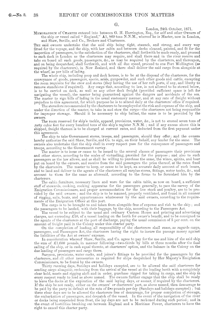 G. London, 24th October, 1871. Memorandum of Chaetee entered into between G. H. Harrington, Esq., for self and other Owners of the ship or vessel called " England," AI, 860 tons N.N.M., whereof he is Master, now in London, and Shaw, Saville, and Co., Brokers and Charterers. The said owners undertake that the said ship being tight, staunch, and strong, and every way fitted for the voyage, and the ship, with her cabin and between decks cleaned, painted, and fit for the inspection of passengers, to the satisfaction of the charterers, shall forthwith be made ready, and proceed to such dock in London as the charterers may require, and shall there and in the river receive and take on board all such goods, passengers, &c, as may be required by the charterers, and thereupon, and on being despatched, shall forthwith, and with all due speed, proceed to one Port Wellington (as required by the charterers), in New Zealand, and there shall deliver the said cargo from alongside at the wharf, as per bills of lading. The whole ship, including poop and deck houses, is to be at the disposal of the charterers, for the conveyance of goods, passengers, specie, acids, gunpowder, and such other goods and cattle, excepting the room requisite for the crew and stores (they having the use of her raft ports, if any, and liberty to remove stanchions if required). Any cargo that, according to law, is not allowed to be stowed below, is to be carried on deck, as well as any other deck freight (provided sufficient space is left for navigating the vessel), the master being guaranteed against the dangers and accidents of the sea. The master to sign bills of lading in the usual customary manner, and at any rate of freight without prejudice to this agreement, for which purpose he is to attend daily at the charterers' office if required. The stevedore recommended by the charterers to be employed at the risk and expense of the ship, and under the direction of the master, to take in and stow the cargo —the charterers not being responsible for improper stowage. Should it be necessary to ship ballast, the same is to be provided by the owners. The room reserved for ship's tackle, apparel, provisions, water, &c, is not to exceed seven tons of /orty cubic feet for every hundred tons of the ship's register N.N.M. ; and if any excess above this is shipped, freight thereon is to be charged at current rates, and deducted from the first payment under this agreement. The ship to take Government stores, troops, and passengers, should they offer; and the owners hereby authorize the said Shaw, Saville, and Co. to sign, on their behalf, any tender for the same. The owners also undertake that the ship shall in every respect pass for the conveyance of passengers and troops, according to the Government survey. The master is to issue or cause to be issued to the several classes of passengers their provisions and other stores, according to the scales of victualling, provided for the purpose ; and also to such passengers as the law allows, and as shall be willing to purchase the same, the wines, spirits, and beer put on board by the owners, and receive from the said passengers the price thereof, at the rates fixed by the charterers. The master to keep, or cause to be kept, an accurate daily account of such issues, and to land and deliver to the agents of the charterers all surplus stores, fittings, water tanks, &c, and account to them for the same as aforesaid, according to the forms to be furnished him by the charterers. The cabin furniture, necessary linen and ware for the cabin table, as now on board, a sufficient staff of stewards, cooking, cooking apparatus for the passengers generally, to pass the survey of the Emigration Commissioners, and proper accommodation for the live stock and poultry, are to be provided by the said owners ; and the ship is to be manned, properly ventilated, and found in all manner of rigging, sails, boats, and appurtenances whatsoever by the said owners, according to the requirements of the Emigration Officer at this port. The cargo is to be brought to and taken from alongside free of expense and risk to the ship ; and the passengers to be landed, with their baggage, by the ship, according to the Passengers Act. The vessel to be subject to the usual and ordinary Custom House and printing and advertising charges, not exceeding £10, of a vessel loading on the berth for owner's benefit, and to be consigned to the agents of the charterers at the port of discharge, paying the usual commission of 5 per cent, on the amount of freight paid in the Colony under this charter party. On the completion of loading, all responsibility of the charterers shall cease, as regards cargo, passengers, and Passengers Act, the charterers having the right to insure the passage money against the liabilities of the Act at owners' expense. In consideration whereof Shaw, Saville, and Co. agree to pay for the use and hire of the said ship the sum of £1,600 pounds, in manner following—two-thirds by bills at three months after the final sailing of the ship, or in cash equal thereto, at charterers' option, and the balance in the Colony on the due landing of passengers and cargo there. Surgeon, provisions, water casks, and. joiner's fittings to be provided for the passengers by the charterers, and all other necessaries as required for ships despatched by Her Majesty's Emigration Commissioners, to be found by the owners. Thirty running days, Sundays and holidays excepted, are to be allowed the said charterers for sending cargo alongside, reckoning from the arrival of the vessel at the loading berth with a completely clear hold, masts and rigging aloft and in order, purchase rigged for taking in cargo, and the ship in every respect ready to load as above named. The owners further engage that the ship shall be ready to leave the docks at the expiration of the said laying days, or sooner, if required by the charterers. If the ship be not ready, eithe