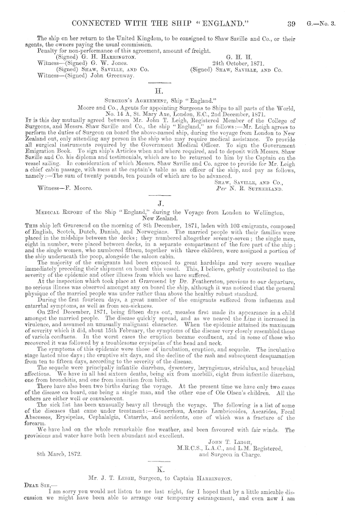 The ship on her return to the United Kingdom, to be consigned to Shaw Saville and Co., or their agents, the owners paying the usual commission. Penalty for non-performance of this agreement, amount of freight. (Signed) G. H. Haretngton. G. H. H. Witness—(Signed) G. W. Jones. 24th October, 1871. (Signed) Shaw, Saville, and Co. (Signed) Shaw, Saville, and Co. Witness—(Signed) John Greenway. H. Suegeon's Agreement, Ship "England." Moore and Co., Agents for appointing Surgeons to Ships to all parts of the World, No. 14 A, St. Mary Axe, London, E.C., 2nd December, 1871. It is this day mutually agreed between Mr. John T. Leigh, Eegistered Member of the College of Surgeons, and Messrs. Shaw Saville and Co., the ship "England," as follows: —Mr. Leigh agrees to perform the duties of Surgeon on board the above-named ship, during the voyage from London to New Zealand out, only attending any person in the ship who may require medical assistance. To provide all surgical instruments required by the Government Medical Officer. To sign the Government Emigration Book. To sign ship's Articles when and where required, and to deposit with Messrs. Shaw Saville and Co. his diploma and testimonials, which are to be returned to him by the Captain on the vessel sailing. In consideration of which Messrs. Shaw Saville and Co. agree to provide for Mr. Lei°h a chief cabin passage, with mess at the captain's table as an officer of the ship, and pay as follows, namely: —The sum of twenty pounds, ten pounds of which are to be advanced. Shaw, Saville, and Co., Witness—F. Moore. Per N. E. Sutherland.