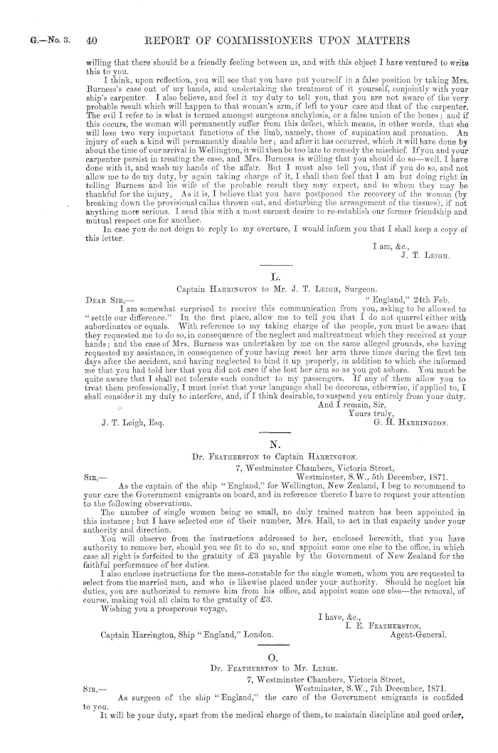 0. Dr. Featherston to Mr. Leigh. 7, Westminster Chambers, Victoria Street, Sir, — Westminster, S.W., 7th December, 1871. As surgeon of the ship " England," the care of the Government emigrants is confided to you. It will be your duty, apart from the medical charge of them, to maintain discipline and good order,