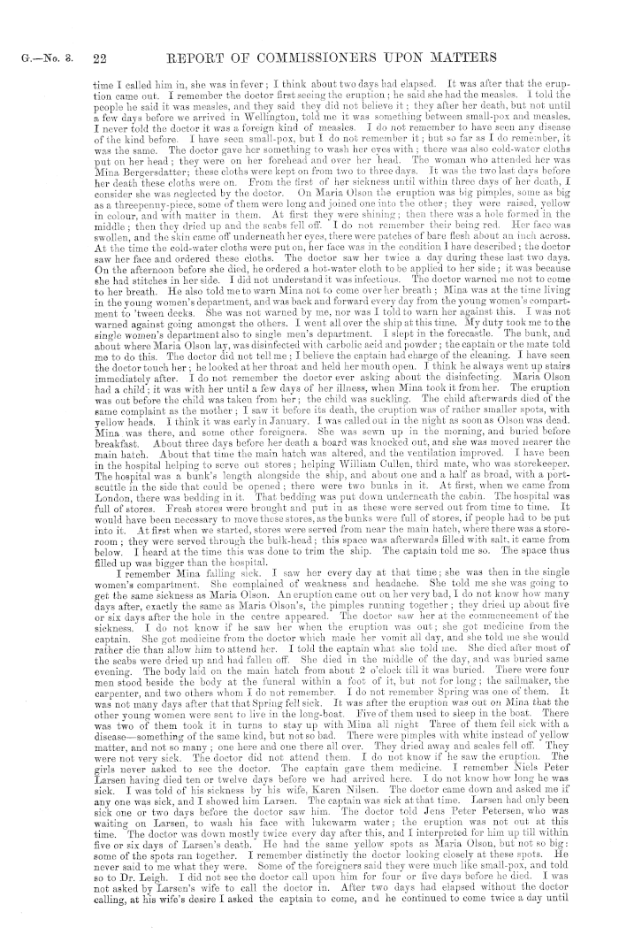 A reference to the extracts from the official log between the 12th and 21st January shows that in that period no less than five children died, the causes of death being stated to be " morbilli, diarrhoea, and exhaustion." The firstdeath among the adults was that of a married woman, the wife of Christopher Ericksen, whose name appears in the official log as " Maria Olson," but whose real name was " Bertha Maria Olsdatter." She fell ill about the 20th December, and an eruption, with glossy pimples, appeared on the 26th. The character which this eruption assumed is described in a distinct manner by several witnesses, and, notwithstanding that it is not so described by the surgeon, there is no doubt that it was the pustular eruption which is characteristic of small-pox. The evidence of the medical witness (Dr. Johnston) is conclusive on this point. The description of the disease, stated to have been written at the time by the surgeon in. his journal, discloses its fearful nature; and the pitiable appearance of this woman towards the close of her illness, will be found described in the evidence of several other witnesses. The case appears to have been treated as one of " malignant measles " by the surgeon, and she eventually died on the 2nd January, 1872. It appears that no steps were taken to isolate this woman, or to remove the people who slept near her, but she was moved from one bunk to another close under the main hatch, so as to secure the benefit of better air when the hatchway could be kept open. She had a child at the breast, which died on the 14th January, having presented the same appearance as the mother, but in a modified degree. The woman above mentioned had been nursed in her illness by a single woman named Mina Bergersdatter, who took ill almost immediately afterwards. In her case the eruption appeared in the same form, and the pitted character of the pustule which is peculiar to small-pox is distinctly testified to. She eventually died on the Ist Pebruary. The immediate cause of death is stated to have been a chest complaint, accelerated by getting suddenly into a colder latitude. The third fatal case among the adults was that of Neils Peter Larsen, whose name is recorded in the official log as Peter Neilson. He fell ill on the 14th Pebruary. The evidence given by several witnesses identifies his appearance, with respect to the character of the eruption, with that of the woman Maria Olson. He died on the 3rd March. In all these cases, the symptoms described, and the opinions we have received from competent medical authority, lead us to the conclusion that although there are slight differences in the description of the appearance of the eruption, they suffered from the same disease, and there seems to be no reasonable doubt that that disease was small-pox. Several other adult cases followed, both among the passengers and the ship's officers and crew, but none of them were fatal. Indeed, at one period of the voyage there was not a part of the ship in which disease did not exist; and considering the way in which the people were cooped up with an infectious disease right in their midst and no effectual isolation, it seems difficult to imagine how a greater mortality did not occur. One of the worst of the non-fatal cases appears to have been that of a ship's apprentice named Spring, whose evidence will be found at page 12 of Appendix. Spring was examined before us, and in appearance is so pitted as to leave no doubt, even in the mind of a non-professional person, that he suffered from small-pox. Direct testimony, however, as to the nature of Spring's case will be found in the evidence attached. During the progress of the disease on board, the only attempt at isolation was the removal of the single women to the long-boat, which was housed over for them after Mina became ill. Reference has already been made to the unfitness of the hospital for the purpose intended; but it seems to us that it might have been possible to make some arrangement, even between decks, which would have had the effect of limiting the spread of the infection, as, from the history of the cases, it appears to have required direct contact for its propagation. Thus the two fatal cases among the adults occurred between decks, and the woman Mina became infected by attending on Maria Olson, and was allowed to carry infection among the single women in the saloon. In not preventing this, we think the surgeon was to blame; because, even supposing that his opinion of the disease was that it was only measles, yet he admits its malignant character, and it would there--2