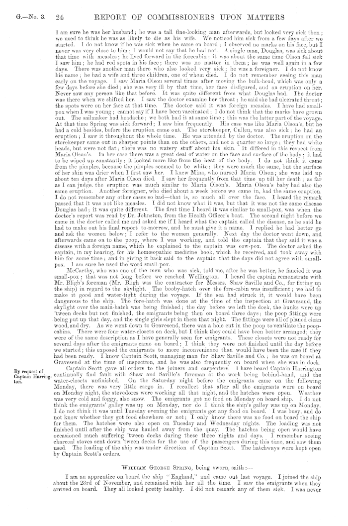 I am sure he was her husband ; he was a tall fine-looking man afterwards, but looked very sick then ; we used to think he was as likely to die as his wife. We noticed him sick from a few days after we started. Ido not know if he was sick when he came on board ; I observed no marks on his face, but I never was very close to him ; I would not say that he had not. A single man, Douglas, was sick about that time with measles ; he lived forward in the forecabin ; it was about the same time Olson fell sick I saw him ; he had red spots in his face; there was no matter in them ; he was well again in a few days. There was another man there who also looked very sick ;he was a foreigner. Ido not know his name ; he had a wife and three children, one of whom died. I do not remember seeing this man early on the voyage. I saw Maria Olson several times after moving the bulk-head, which was only a few days before she died ; she was very ill by that time, her face disfigured, and an eruption on her. Never saw any person like that before. It w ras quite different from what Douglas had. The doctor was there when we shifted her. I saw the doctor examine her throat; he said she had ulcerated throat; the spots were on her face at that time. The doctor said it was foreign measles. I have had smallpox when I was young ; cannot say if I have been vaccinated ; I do not think that the marks have grown out. The sailmaker had headache ; we both had it at same time ; this was the latter part of the voyage. At that time Spring was sick forward ; I saw him frequently. His case was like Maria Olson's, but he had a cold besides, before the eruption came out. The storekeeper, Cullen, was also sick ; he had an eruption ; I saw it throughout the whole time. He was attended by the doctor. The eruption on the storekeeper came out in sharper points than on the others, and not a quarter so large ; they had white heads, but were not flat; there was no watery stuff about his skin. It differed in this respect from Maria Olson's. In her case there was a great deal of water on the face and surface of the body ; it had to be wiped up constantly; it looked more like from the heat of the bod}-. I do not think it came from the pimples, because the pimples seemed to be white; they were much the same, but the surface of her skin was drier when I first saw her. I knew Mina, who nursed Maria Olson; she was laid up about ten days after Maria Olson died. I saw her frequently from that time up till her death ; as far as I can judge, the eruption was much similar to Maria Olson's. Maria Olson's baby had also the same eruption. Another foreigner, who died about a week before we came in, had the same eruption. Ido not remember any other cases so bad —that is, so much all over the face. I heard the remark passed that it was not like measles. I did not know what it was, but that it was not the same disease Douglas had; it was quite different. The first time I heard it was similar to small-pox, was when the doctor's report was read by Dr. Johnston, from the Health Officer's boat. The second night before we came in the doctor called me and asked me if I heard what the captain called the disease, as he said he had to make out his final report to-morrow, and he must give it a name. I replied he had better go and ask the women below; I refer to the women generally. Next day the doctor went down, and afterwards came on to the poop, where I was working, and told the captain that they said it was a disease with a foreign name, which he explained to the captain was cow-pox. The doctor asked the captain, in my hearing, for his homoeopathic medicine book, which he received, and took away with him for some time ; and in giving it back said to the captain that the days did not agree with smallpox. lam sure he used the word small-pox. McCarthy, who was one of the men who was sick, told me, after he was better, he fancied it was small-pox ; that was not long before we reached Wellington. I heard the captain remonstrate with Mr. Bligh's foreman (Mr. Bligh was the contractor for Messrs. Shaw Saville and Co., for fitting up the ship) in regard to the skylight. The booby-hatch over the fore-cabin was insufficient; we had to make it good and water-tight during the voyage. If the sea had struck it, it would have been dangerous to the ship. The fore-hatch was done at the time of the inspection at Gravesend, the skylight over the main-hatch was being finished; the day before we left the dock, the bunks were up 'tween decks but not finished, the emigrants being then on board three days; the poop fittings were being put up that day, and the single girls slept in them that night. The fittings were all of planed clean wood, and dry. As we went down to Gravesend, there was a hole cut in the poop to ventilate the poopcabins. There were four water-closets on deck, but I think they could have been better arranged; they were of the same description as I have generally seen for emigrants. These closets were not ready for several days after the emigrants came on board; I think they were not finished until the day before we started; this exposed the emigrants to more inconvenience than would have been the case if they had been ready. I know Captain Scott, managing man for Shaw Saville and Co.; he was on board at Gravesend at the time of inspection, and he was also frequently on board when she was in dock. Captain Scott gave all orders to the joiners and carpenters. I have heard Captain Harrington continually find fault with Shaw and Saville's foreman at the work being behind-hand, and the water-closets unfinished. On the Saturday night before the emigrants came on the following Monday, there was very little cargo in. I recollect that after all the emigrants were on board on Monday night, the stevedores were working all that night, and the hatches were open. Weather was very cold and foggy, also snow. The emigrants got no food on Monday on board ship. Ido not think the emigrants' ga