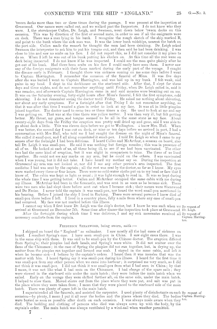 'tween decks more than two or three times during the passage. I was present at the inspection at Gravesend. Our names were called out, and we walked past the Inspectors. Ido not know who they were. I, the storekeeper Cullen, Dr. Leigh, and Swenson, went down below 'tween decks on this occasion. This was by direction of the first or second mate, in order to see if all the emigrants were on deck. There was a man lying in his bunk. I recognize the rough sketch of the ship marked B, and point to the bunk where the sick man was. It was the lower bunk midships, nearest the hatch on the port side. Cullen made the remark he thought the man had been drinking. Dr. Leigh asked Swenson the interpreter to ask him to put his tongue out, and then said he had been drinking. I was close to him and saw no scabs on his face. I did not report this, as I did not consider it my place to do so. When I left he was out of his bunk putting his clothes on. At this time all the rest were on deck being inspected. Ido not know if he was inspected. I could see the man quite plainly after he got out of his bunk. Had there been scabs on his face I could easily have seen them. I never saw any of the foreign emigrants with their faces marked during the early part of the voyage. I caught the disease early in February. I thought there was sickness coming on me some days before I went to Captain Harrington. I remember the occasion of the funeral of Mina. It was five days after she was buried I went to Captain Harrington, and was laid up in my bunk. I felt weak, and pains in my head. I slept in the deckhouse on the starboard side. After that, I slept for three days and three nights, and do not remember anything until Friday, when Dr. Leigh called in, said itwas measles, and afterwards Captain Harrington came in and said measles were breaking out on me. It was on the Saturday evening, forty-eight hours after Mina's funeral, I felt the. first symptoms, cold shivering. Ido not remember seeing the doctor until Friday. He asked me nothing about shivering, nor about any early symptoms. For a fortnight after that Friday I do not remember anything, so that it was after that time I wanted a glass in order to look at my face. It was all in little pimples joined together. The doctor used to come two or three times a day. He used to look at me and say I was getting on. That was at the time there was yellow matter. I was then very ill, but felt getting better. My throat, my gums, and tongue seemed to be all in the same state as my face. About twenty-eight days from the Friday the eruption was pretty well dried up and gone, and I was able to go about deck a little. This was eleven days before we got to Wellington, i know Mrs. Hall. When I was better, the second day I was out on deck, or nine or ten days before we arrived in port, I had a conversation with Mrs Hall, who told me I had caught the disease on the night of Mina's funeral. She called it small-pox, and I all along considered it small-pox. I told Dr. Leigh so when I came to my senses after the fortnight I had been delirious. I heard Cullen and McArthur, a seaman on board, also tell Dr. Leigh it was small-pox. He said it was nothing but foreign measles ; this was in presence of all of us. He looked at each, of us, all three being ill, to see if we had been vaccinated. The other two had the same kind of eruption, but it was slight in comparison to mine. The three of us lived together. He could not see any marks on my arm, but he could on the others. I was vaccinated when I was young, but it did not take. I have heard my mother say so. During the inspection at Gravesend my arm was not looked at, nor did I see any other person's arm inspected. The first medicine I had was sent by the captain; all the rest was sent by the doctor, so far as I know. My eyes were washed every three or four hours. There were no cold-water cloths put on to my head or face that I know of. The cabin was kept as light as usual; it was light enough to read in. It was so kept during the whole time I was getting better. Cullen and McArthur occupied the same cabin with me during my illness. McArthur had been in the forecastle, and was sent in as soon as he became sick. There were two men who had slept there before sent out when I became sick ; their names were Shearwood and De Freize. I never told the captain it was small-pox, nor heard the word small-pox mentioned in his hearing. Before I joined the ship I lived in Barking. There were several persons I knew died of small-pox there before I left. I lived in a country place, fully a mile from where any case of small-pox had occurred. My face was not marked before this illness. I cannot say when I first knew Dr. Leigh was the ship's doctor, but I knew he was such when we arrived at Gravesend on December 7th. Some time after dinner the inspection took place at Gravesend. After the fortnight during which time I was delirious, I and my sick messmates received all necessary comforts from the captain. Feedeeick Shearwood, being sworn, saith: — I shipped on board the " England "as sailmaker. I saw mostly all the bad cases of sickness on board. I recollect Spring's case. I have seen small-pox in China. I saw eight cases there. I was in the same ship with them. It was said to be small-pox by the Chinese doctor. Tho eruption differed from Spring's; their pimples had dark heads, and Spring's were white. It did not scatter over the faces of the Chinamen ; in the case of Spring the pimples did not run together, but, in drying up, the matter from the pimples ran together and formed one scab. I stayed in the same cabin, and left it when he became sick—l believe by the captain's orders. I heard then it was measles that was the matter with him. I heard Spring say it was small-pox during his illness. I heard for the first time it was small-pox from any other person when we came into harbour; it surprised me very much, as I did not think it was small-pox. I did not think it was sm