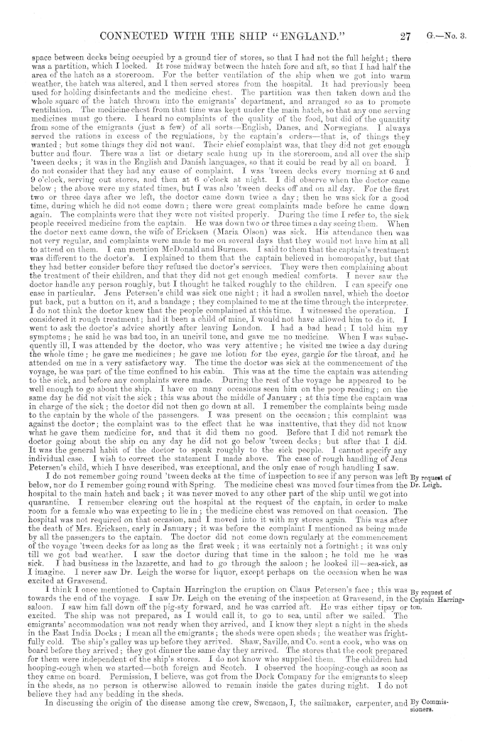 paid my expenses. The man who had scabs on his face when we went on board recovered. My wife is now slightly pock-marked, as the result of her illness. On the occasion of the visit of Dr. Leigh, forty-eight hours before the death of Alex. Burness, in 8" the captain's presence, the doctor asked Mrs. Burness what she was crying for ; he said " the child, has nothing the matter with it—put the kid into the bunk;" the captain reproved the doctor. Mrs. Burness's infant was at once put in charge of a nurse, by the captain's order, on the occasion of Mrs. Burness breaking her arm. I was asked by Dr. Leigh to allow him to lance my child's gums, and I refused, because the teeth were already through ; he asked me again next morning, and, representing that the child might take fits, I allowed him to do it; the rash had then been out two days on the child. He did not come every day during the first part of the sickness while the eruption was coming out. Additional reasons besides the one stated for my not having confidence in the doctor were, on account of his treatment of Burness's children and my own wife. One day my wife asked him for some castor oil, and he told her there was none on board ship ; this was in the early part of the voyage. I never called on the doctor to attend me or my family during the voyage. Ciiaeles Batt, being sworn, saith as follows: — lam chief officer of the " England." I have a mate's certificate. This is my second voyage in the ship. I rejoined the ship about three days before she left on this voyage. She had about half her cargo in ; the emigrants were on board. I remember an inspection being made of the ship in the East India Docks; inspection was made from time to time while she was being fitted up. I remember Inspectors suggesting alteration in the ventilation of that part of the poop allotted to single girls. I remember an inspection of the ship at Gravesend. I took part in the inspection, in the absence of the captain. Dr. Featherston was one of the inspectors and two others. Cannot say one. was a medical man. They came on board about 3 o'clock. I refer to the ship's log for this and other dates. I have kept this log during the voyage in my own handwriting; the entries are made daily. The survey occupied two hours ; they first inspected the galley, then the fittings for the emigrants 'tween decks, both fore and aft; they suggested no alterations. They then examined the boats, then the passengers. They called each family separately on the poop ; none of them was found to be sick at that time. They had a list, and I saw them mark them off as they were called; no one was omitted from the examination, to my knowledge. If any of the sailors had been sent to get up any one from below I would have known of it. I know Erick'sen, one of the foreign emigrants. I. must have seen him at the beginning of the voyage, but do not recollect anything as to his appearance at that time. He was ill. I believe I saw a rash on him after we got to sea. There may have been a rash on him at the time of inspection, but I did not notice it then. I was very frequently between decks ; the emigrants kept their quarters very dirty at first; this was due to sea-sickness, I believe. I had charge of the sanitary arrangements; the 'tween decks was cleaned every morning — scraping, dry-scrubbing, and washing as often as weather permitted. Chloride of lime was used for disinfecting whenever it was required; it was used three or four times a day after we had disease; this was all done by direction of the master. The same arrangements were carried out in the forward department. Bough sketch of ship produced to me, marked B, is correct. On 27th December two or three cases of measles were reported to me. Made no difference in our arrangements except in the freer use of disinfectants. If small-pox had been reported to me, it would have made a difference in our arrangements. Did not think it anything unusual until I saw one or two deaths. Never saw measles or small-pox before. There was an unpleasant smell 'tween decks, but cannot say where it came from ; did all we could to prevent it. It was not bilge water, it was a close smell. I think there was plenty of ventilation, the main hatch being off so soon as weather permitted. Consider there was sufficient light. The hospital was occupied with stores ;it was a serving-out room. The sick were not put in the hospital; Ido not know the reason why. It would be the doctor's duty to order the sick into hospital. The official log, marked A, I identify as the ship's log. It has been in my charge during the voyage. Events are entered in it as they occur. I remember the married woman that died first. She occupied midship bunk on port side by main hatch. She was the wife of Ericksen, before referred to. After she was taken ill, one of the bunks was taken down, so as to allow her to have more room. I understood she died of measles; I had this from the doctor. I thought it was different from what the children had, but that it was measles of a more virulent form. She was buried at once, her bedding was hove overboard, and the place thoroughly cleaned. Ido not see that, had we known it was small-pox, anything further could have been done in the way of cleaning and disinfecting; but some steps might have been taken to separate the sick from those who were well. At a subsequent date, something was done in separating the girls, who were put in the long-boat. This was done because it was believed the disease was spreading. I never heard it referred to as small-pox by the interpreter or any one else. The first I heard of it being small-pox was after we got into port. It spread among the cabin passengers, and also among the men in the forecabin. It appeared forward about the Bth of February. The sailmaker and the storekeeper were the only ones that had to do with the people who died after: they were both 'ill. Cannot say if the sailmaker had the same complaint; he had no e