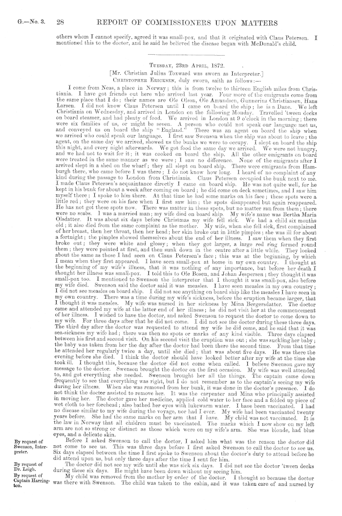 Tuesday, 23rd April, 1872. [Mr. Christian Julius Toxward was sworn as Interpreter.] Cheistoph.ee Eeicksen, duly sworn, saith as follows: — I come from Neas, a place in Norway; this is from twelve to thirteen English miles from Christiania. 1 have got friends out here who arrived last year. Four more of the emigrants come from the same place that I do ; their names are Ole Olson, Ole Amundsen, Gumierius Christiansen, Hans Larsen. I did not know Claus Petersen until I came on board the ship ;he is a Dane. We left Christiania on Wednesday, and arrived in London on the following Monday. Travelled 'tween decks on board steamer, and had plenty of food. We arrived in London at 9 o'clock in the morning ; there were six families of us, or might be seven. A person who could not speak our language met us, and conveyed us on board the ship " England." There was an agent on board the ship when we arrived who could speak our language. I first saw Swenson when the ship was about to leave ; the agent^ on the same day we arrived, showed us the bunks we were to occupy. I slept on board the ship this night, and every night afterwards. We got food the same day we arrived. We were not hungry, and we had not to wait for it; it was cooked on board the ship. All the other emigrants on board were treated in the same manner as we were ; I saw no difference. None of the emigrants after I arrived slept in a shed on the wharf; they all slept on board ship. There were emigrants from Hamburgh there, who came before I was there ; Ido not know how long. I heard of no complaint of any kind during the passage to London from Christiania. Claus Petersen occupied the bunk next to me. I made Claus Petersen's acquaintance directly I came on board ship. He'was not quite well, for he kept in his bunk for about a week after coming on board ; he did come on deck sometimes, and I saw him myself there ; I spoke to him there. At that time ho had some marks on his face ; these spots were a little red ; they were on his face when I first saw him ; the spots disappeared but again reappeared. He has not got these spots now. There was matter in these spots, but no matter ran from them; there were no scabs. I was a married man; my wife died on board ship. My wife's name was Bertha Maria Olsdatter. It was about six days before Christmas my wife fell sick. We had a child six months old; it also died from the same complaint as the mother. My wife, when she fell sick, first complained of her breast, then her throat, then her head; her skin broke out in little pimples ; she was ill for about a fortnight; the pimples showed themselves about the end of her illness. I saw them when they first broke out; they were white and glossy; when they got larger, a large red ring formed round them ; they were pointed at first, and then sunk down in the centre after a little while. They looked about the same as those I had seen on Claus Petersen's face ; this was at the beginning, by which I mean when they first appeared. I have seen small-pox at home in my own country. I thought at the beginning of my wife's illness, that it was nothing of any importance, but before her death I thought her illness was small-pox. I told this to Ole Bosen, and Johan Jespersen ; they thought it was small-pox too. I mentioned to Swenson the interpreter that I thought it was small-pox, also before my wife died. Swenson said the doctor said it was measles. I have seen measles in my own country ; I did not see measles on board ship. I did not see anything on board ship like the measles I have seen in my own country. There was a time during my wife's sickness, before the eruption became larger, that I thought it was measles. My wife was nursed in her sickness by Mina Bergersdatter. The doctor came and attended my wife at the latter end of her illness; he did not visit her at the commencement of her illness. I wished to have the doctor, and asked Swenson to request the doctor to come down to my wife. For three days after that he did not come. I did not see the doctor during these three days. The third day after the doctor was requested to attend my wife he did come, and he said that it was sea-sickness my wife had; there was then no spots or marks of any kind visible. Three days elapsed between his first and second visit. On his second visit the eruption was out; she was suckling her baby; the baby was taken from her the day after the doctor had been there the second time. From that time he attended her regularly twice a day, until she died ; that was about five days. He was there the evening before she died. I think the doctor should have looked better after my wife at the time she took ill. I thought this, because the doctor did not come when called. I believe Swenson gave my message to the doctor. Swenson brought the doctor on the first occasion. My wife was well attended to, and got everything she needed. Swenson brought her all the things. The captain came down frequently to see that everything was right, but I do not remember as to the captain's seeing my wife during her illness. When she was removed from her bunk, it was done in the doctor's presence. Ido not think the doctor assisted to remove her. It was the carpenter and Mina who principally assisted in moving her. The doctor gave her medicine, applied cold water to her face and a folded up piece of wet cloth to her forehead; also bathed her eyes with lukewarm water. I have been vaccinated. I had no disease similar to my wife during the voyage, nor had I ever. My wife had been vaccinated twenty years before. She had the same marks on her arm that I have. My child was not vaccinated. It is the law in Norway that all children must be vaccinated. The marks which I now show on my left arm are not so strong or distinct as those which were on my wife's arm. She was blonde, had blue eyes, and a delicate skin. Before I asked Swenson to call the doctor, I asked him what was the reason the doctor did not come to see us. This was th