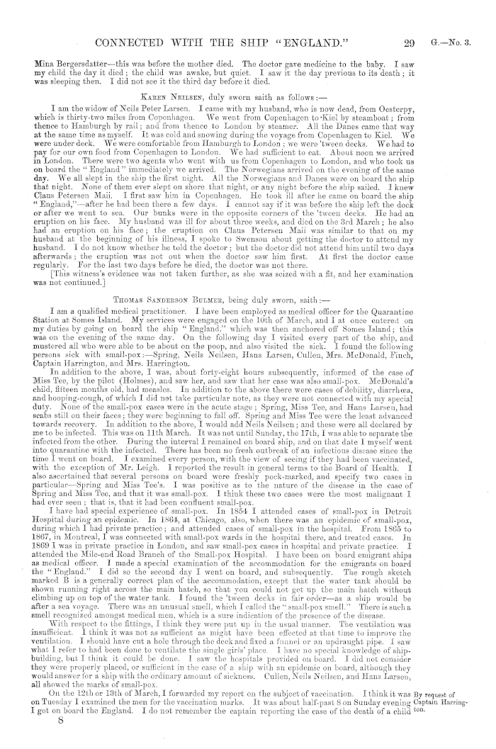 Mina Bergersdatter—this was before the mother died. The doctor gave medicine to the baby. I saw my child the day it died ; the child was awake, but quiet. I saw it the day previous to its death ; it was sleeping then. I did not see it the third day before it died. Kaeen Neilsen, duly sworn saith as follows : — lam the widow of Neils Peter Larsen. I came with my husband, who is now dead, from Oesterpy, which is thirty-two miles from Copenhagen. Wo went from Copenhagen to -Kiel by steamboat; from thence to Hamburgh by rail; and from thence to London by steamer. All the Danes came that way at the same time as myself. It was cold and snowing during the voyage from Copenhagen to Kiel. We were under deck. We were comfortable from Hamburgh to London ;we were 'tween decks. We had to pay for our own food from Copenhagen to London. We had sufficient to eat. About noon we arrived in London. There were two agents who went with us from Copenhagen to London, and who took us on board the " England " immediately we arrived. The Norwegians arrived on the evening of the same day. Wo all slept in the ship the first night. All the Norwegians and Danes were on board the ship that night. None of them ever slept on shore that night, or any night before the ship sailed. I knew Claus Petersen Maii. I first saw him in Copenhagen. Ho took ill after he came on board the ship "England," —after ho had been there a few days. I cannot say if it was before the ship left the dock or after we went to sea. Our bunks were in the opposite corners of the 'tween decks. He had an eruption on his face. My husband was ill for about three weeks, and died on the 3rd March ;he also had an eruption on his face; the eruption on Claus Petersen Maii was similar to that on my husband at the beginning of his illness, I spoke to Swenson about getting the doctor to attend my husband. Ido not know whether he told the doctor ; but the doctor did not attend him until two days afterwards ; the eruption was not out when the doctor saw him first. At first the doctor came regularly. For the last two days before he died, the doctor was not there. [This witness's evidence was not taken further, as she was seized with a fit, and her examination was not continued.] Thomas Sandeeson Bulmee, being duly sworn, saith: — lam a qualified medical practitioner. I have been employed as medical officer for the Quarantine Station at Somes Island. My services were engaged on the 10th of March, and lat once entered on my duties by going on board the ship "England," which was then anchored off Somes Island; this was on the evening of the same day. On the following day I visited every part of the ship, and mustered all who were able to be about on the poop, and also visited the sick. I found the following persons sick with small-pox: —Spring, Neils Neilsen. Hans Larsen, Cullen, Mrs. McDonald, Finch, Captain Harrington, and Mrs. Harrington. In addition to the above, I was, about forty-eight hours subsequently, informed of the case of Miss Tee, by the pilot (Holmes), and saw her, and saw that her case was also small-pox. McDonald's child, fifteen months old, had measles. In addition to the above there were cases of debility, diarrhoea, and hooping-cough, of which I did not take particular note, as they were not connected with my special duty. None of the small-pox cases were in the acute stage ; Spring, Miss Tee, and Hans Larsen, had scabs still on their faces ; they were beginning to fall off. Spring and Miss Tee were the least advanced towards recovery. In addition to the above, I would add Neils Neilsen ; and these were all declared by me to be infected. This was on 11th March. It was not until Sunday, the 17th, I was able to separate the infected from the other. During the interval I remained on board ship, and on that date I myself went into quarantine with the infected. There has been no fresh outbreak of an infectious disease since the time I went on board. I examined every person, with the view of seeing if they had been vaccinated, with the exception of Mr. Leigh. I reported the result in general terms to the Board of Health. I also ascertained that several persons on board were freshly pock-marked, and specify two cases in particular—Spring and Miss Tee's. I was positive as to the nature of the disease in the case of Spring and Miss Tee, and that it was small-pox. I think these two cases were the most malignant I had ever seen ; that is, that it had been confluent small-pox. I have had special experience of small-pox. In 1854 I attended cases of small-pox in Detroit Hospital during an epidemic. In 1864, at Chicago, also, when there was an epidemic of small-pox, during which I had private practice ; and attended cases of small-pox in the hospital. From 1865 to 1867, in Montreal, I was connected with small-pox wards in the hospital there, and treated cases. In 1869 I was in private practice in London, and saw small-pox cases in hospital and private practice. I attended the Mile-end Eoad Branch of the Small-pox Hospital. I have been on board emigrant ships as medical officer. I made a special examination of the accommodation for the emigrants on board the "England." I did so the second day I went on board, and subsequently. Tho rough sketch marked B is a generally correct plan of the accommodation, except that the water tank should be shown running right across the main hatch, so that you could not get up the main hatch without climbing up on top of the water tank. I found the 'tween decks in fair order —as a ship would be after a sea voyage. There was an unusual smell, which I called the " small-pox smell." There is such a smell recognized amongst medical men, which is a sure indication of the presence of the disease. With respect to the fittings, I think they were put up in the usual manner. The ventilation was insufficient. I think it was not as sufficient as might have been effected at that time to improve the ventilation. I should have cut a 