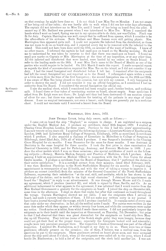 Wednesday, 24th Apeil, 1872. John Thomas Leigh, being duly sworn, saith as follows; —- I came out on board the ship " England," as surgeon in charge. I am registered as a surgeon under tho English Medical Act. I produce my certificate, dated 30th August, 1870. I studied at Charing Cross Hospital, London, for three years. Previous to this I had two years' apprenticeship. lam now twenty-seven years old. I acquired the following diplomas: —Licentiate Society of Apothecaries, London, 1869, and Licentiate Eoyal College of Surgeons, Edinburgh, 1870, as mentioned in certificate which I produce. I also acquired a diploma of Licentiate in Midwifery in College of Surgeons in Edinburgh, dated 22nd July, 1870, all of which I produce. I was Surgeon's Assistant in the Charing Cross Hospital for six months. I was Prosector for the same for three months. I was Assistant in Dentistry in the same hospital for three months. I took the first prize in class examination for Practical Chemistry in 1868, and for Pathology, Anatomy, and Forensic Medicine in 1869. I produce the silver medals which I won on these occasions ; also special certificates of merit on the following subjects : —Botany, Materia Medica, Surgery, and Practice of Medicine, which I produce. After passing, I held an appointment as Medical Officer in connection with the St. Ives Union for about twelve months. I produce a certificate from the Board of Guardians, that I " performed the duties to their entire satisfaction." It is a certified extract from their minutes, dated 22nd February, 1871. I was then Eesident Physician to the North Staffordshire Hospital for six months. I resigned that appointment in consequence of my ill health, and with the view of taking a voyage to improve it. I produce an extract (certified) from the minutes of the General Committee of the North Staffordshire Infirmary, expressing their satisfaction " at the zeal, skill, and assiduity, which he has shown in the discharge of his duties ; and to testify to his high moral character." I obtained the appointment on board the " England "in reply to an advertisement. It was through Messrs. Moore and Co. I made my agreement, which I produce (marked H), and which is signed by Shaw, Saville, and Co. As an additional inducement to what appears in the agreement, I was informed that I would receive from the New Zealand Government a gratuity for the emigrants on board. I joined the ship on December 4th, some time in the afternoon. I slept on shore that night, but after that continued on board throughout the voyage. Captain Harrington showed me my cabin. I saw the emigrants when I arrived on board, and made a cursory inspection of them. I did not make any written entry in my journal. I have kept a journal throughout the voyage, which I produce (marked I). It contains notes of every case that came under my observation ; in fact, all the medical notes I made. The entries were written on the same date under which they appear, or within twenty-four hours, and while the occurrences were under my notice. I took notes on a tablet, from which I made these entries. I did not particularly inspect the emigrants as to their health until the inspection at Gravesend, on Thursday, 7th December; but prior to that I had observed that there was great discomfort for the emigrants on board ship from Monday up till Thursday. They told me (some of the Scotch single girls) they were hungry, because they could not get their food at the proper times; especially the foreigners looked cold and miserable; coughs were very prevalent amongst them. The inspection I made at Gravesend was part of the official inspection. I assisted Dr. Featherston, as I thought it my duty to do so. There were two or three gentlemen officially present on the occasion ; one of them, I believe, was a medical man, from the questions he put to the emigrants. These gentlemen arrived on board about noon, and were occupied about the ship until about 3 o'clock, when all the emigrants were called aft to the poop, where I stood beside Dr. Featherston ; he held a list of the emigrants, and the clerk held another list. I was not