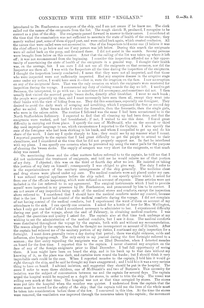 introduced to Dr. Featherston as surgeon of the ship, and lam not aware if he knew me. The clerk called out the names of the emigrants from the list. The rough sketch B, produced, I recognize to be correct as a plan of the ship. The emigrants passed forward in answer to their names. I considered at the time that the examination was not sufficient to ascertain the state of health of the emigrants ; they merely walked past, some of them slipped past, and were called back again, which created confusion. All the names that were called were not answered to. One of the Inspectors told some one (I believe it was the chief officer) to go below and see if any person was left below. During this search the emigrants were all called back on the poop, and detained there. I did not assist in the search. Several persons were brought from below on this occasion. Alter that the calling of the list was taken up where it left off; it was°not recommenced from the beginning. I consider this inspection afforded me a fair opportunity of ascertaining the state of health of the emigrants in a general way. I thought their health was, on the average, fair. I am sure I did not see all the emigrants on that occasion, nor did the Inspector see them all. I was with the Inspectors all the time during the inspection of the emigrants. I thought the inspection loosely conducted ; I mean that they were not all inspected, and that those who were inspected were not sufficiently inspected. Had any eruptive disease in the eruptive stage come under my notice, I would have seen it —that is, were the eruption on the face. I saw no eruption on any of the emigrants' faces. That was the only occasion on which the emigrants were mustered for inspection during the voyage. I commenced my duty of visiting rounds the day we left. I used to get Swenson, the interpreter, to go with me ; he sometimes did accompany, and sometimes did not. I then usually first visited the married people 'tween decks, directly after breakfast. I went to each bunk ; the people were generally up then, and I must necessarily have seen them all, except they went into their bunks with the view of hiding from me. They did this sometimes, especially one foreigner, They desired to avoid the daily work of scraping and scrubbing, which I organized the first or second day after we sailed. After 'tween decks I visited the forecabin, then the forecastle, then the single girls, who were in the saloon cabin. The routine I followed was the same I had been accustomed to in the North Staffordshire Infirmary. I expected to find that all cleaning up had been done, and that the emigrants were washed, and had breakfasted; if not, I waited to see this done. I found great difficulty in carrying out these plans. I specify the case of McDonald, who on the second or third day used improper language to me, which circumstance I reported to the Captain. I also specify the case of the foreigner who had been shirking in his bunk, and whom I compelled to get up and do his share of the work. I dare say I spoke sharply to him ; they could see by my manner what I meant. I reported generally to the captain that I had great difficulty to get the people to^ attend to their cleanliness, and I considered at the time that he did not properly support me. In fact he interfered with my plans. I can specify one occasion when he prevented my using the water pails for the purpose of cleaning the 'tween decks. The supply of scrapers was very short for the emigrants, so that much delay was caused. On mentioning these and the other matters before referred to to tho captain, he told mo that I did not understand the treatment of emigrants, and told me he would relieve me of that portion of my duty. I objected; this was on the third or fourth day after we leit. He insisted on taking this portion of my duty on himself; consequently I was obliged to give way. The duty I refer to is the superintendence of tho sanitary arrangements of the ship generally. The medicine chest and drug stores were placed under my care. The medical comforts were not placed under my care. I was refused surgical appliances before the ship sailed. I can specify splints which I asked for from one of the officials inspecting, which were refused on account of expense. These articles were not included in the list referred to in my agreement. The surgical instruments which I had to provide myself were inspected in my presence by Dr. Featherston, and pronounced by him to be correct. I am not aware of any inspection being made of the medical stores and comforts, except the inspection above referred to. I considered that I should have the medical comforts under my control, because that is the law. I never had control of the medical comforts during the voyage. I did not complain of not having control of the medical comforts, but I experienced the want of them on account of my attendance to the sick. I can specify one occasion. I asked for a bottle of beer for Mrs. Wellington, when I only got one half of what I considered necessary to administer to her. I experienced difficulty during one part of the voyage, about the end of February, in obtaining medical comforts. I was refused the quantities and quality I asked for. The captain also at that time took umbrage at my wishing to see the administration of the medical comforts, but I saw it done. The medical comforts were distributed throughout the voyage by the captain, both with and without my recommendation. The reason alleged by the captain was, that he thought me incompetent on account of ill health. After the captain had relieved me of the sanitary portion of my duties, I continued my daily inspection for a fortnight. I went down generally twice a day during that period ; there was slight sickness, colds and influenza, also hooping-cough. The only entry in my journal during the first fortnight referred to a seaman; the first entry regarding the emigrants was on 22nd December, when I detected meas